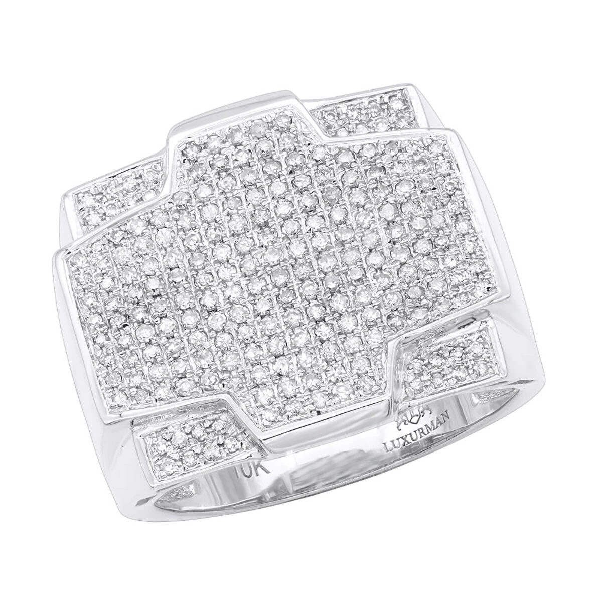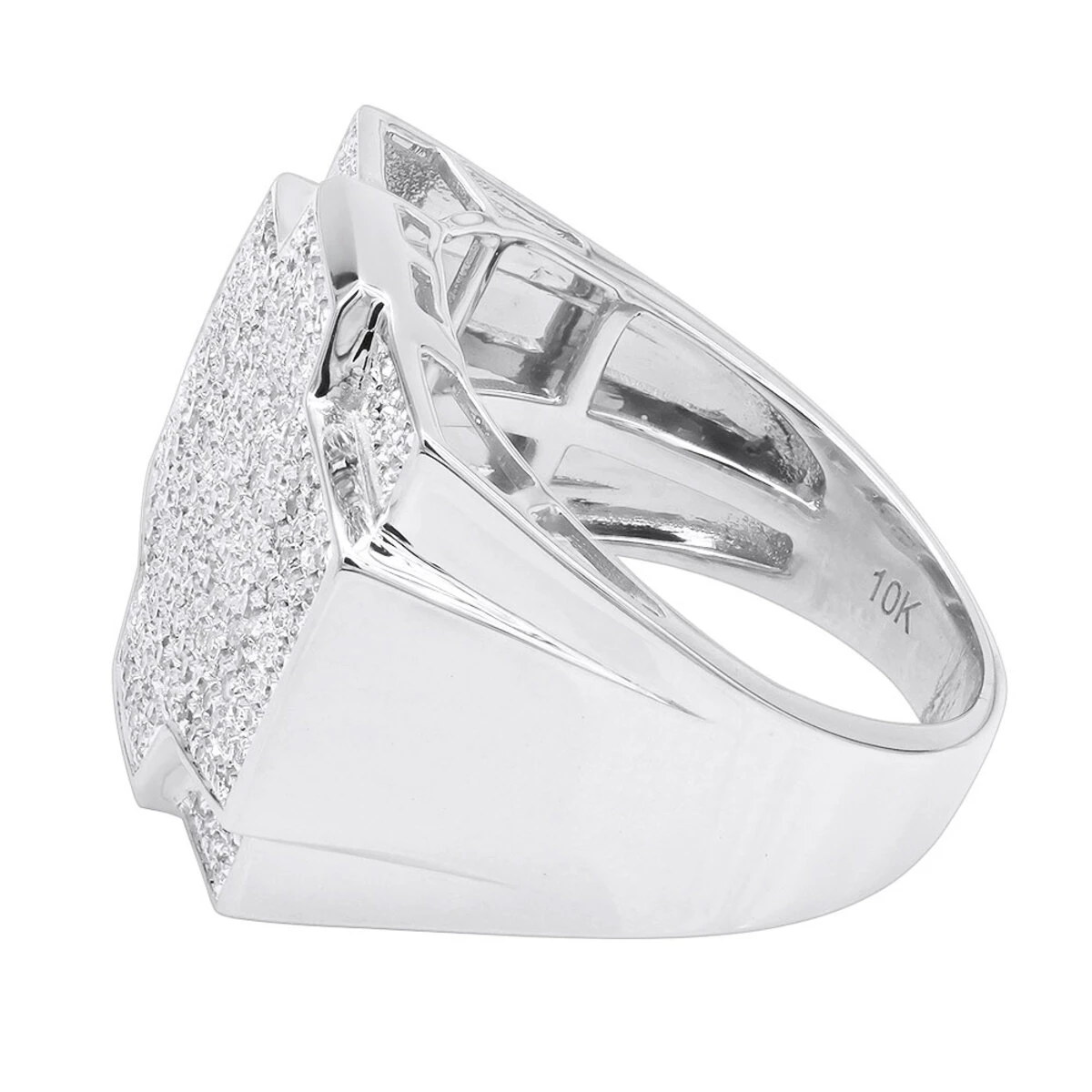 This 1 Carat Men’s Diamond Ring in 10K Gold weighs approximately 8 grams and showcases 1 carat of genuine diamonds. This diamond ring features an oversized design and a luxurious rhodium plating for extra shine.