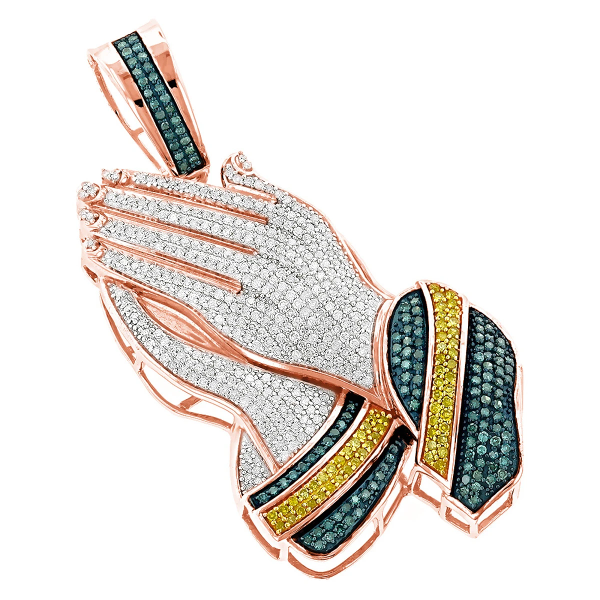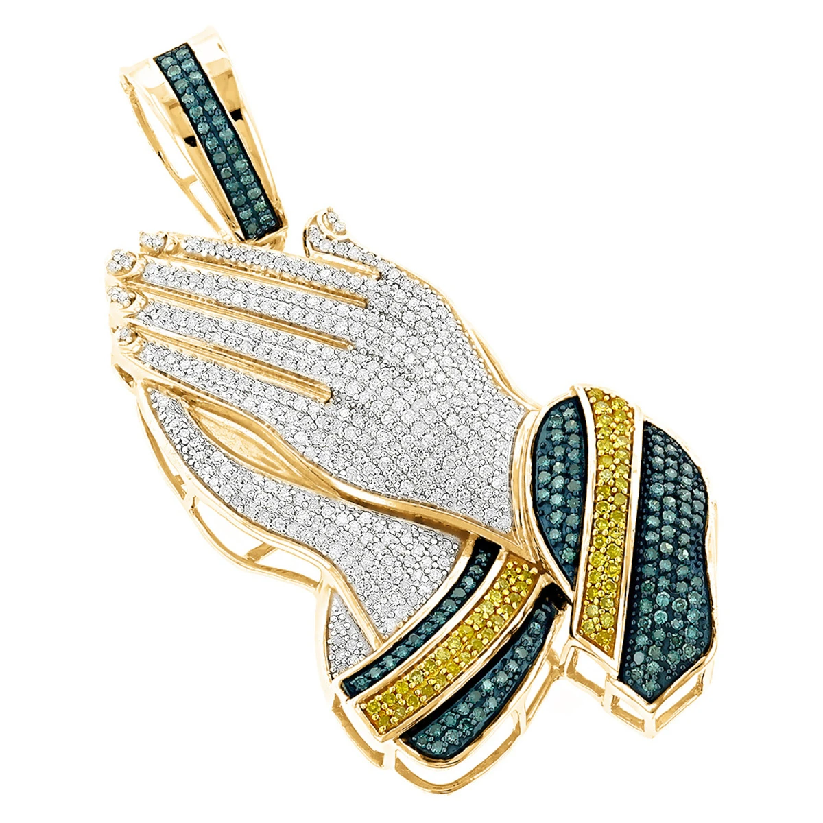 This exquisite 10K Gold Color Diamond Praying Hands Pendant weighs approximately 18 grams and displays 2.75 ctw of dazzling white, fancy yellow and blue round diamonds, each expertly pave set in a lustrous gold frame. Featuring an intricate design, a highly polished gold finish, and a fine gallery back, this diamond praying hands pendant from our fancy color diamond jewelry collection is available in 10K white, yellow and rose gold. You also can personalize this piece or check we’ve already made and create your own design.