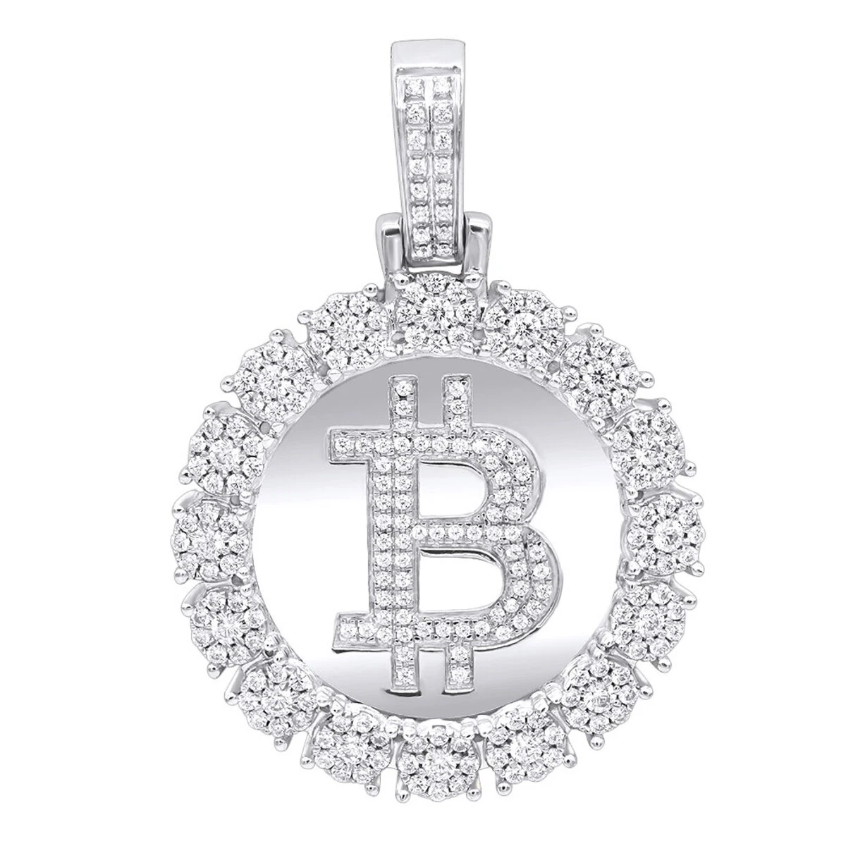 Men’s Diamond Pendants Collection: we are presenting a real 10k gold Bitcoin Pendant decorated with 2 carats of genuine diamonds; this unique looking pendant is done in the form of a men’s circle charm pendant with pave set round diamonds on the bail and B and cluster set diamonds around the medallion. This diamond Bitcoin pendant is 1 13/16in (41mm) is long (with bail) and 1 1/4in (32mm) wide and is available in your choice of yellow gold, white gold or rose gold. Own some Bitcoins or know somebody who does? Buy this amazing charm for yourself or as a timeless present today! You also can personalize this piece or check we’ve already made and create your own design.
