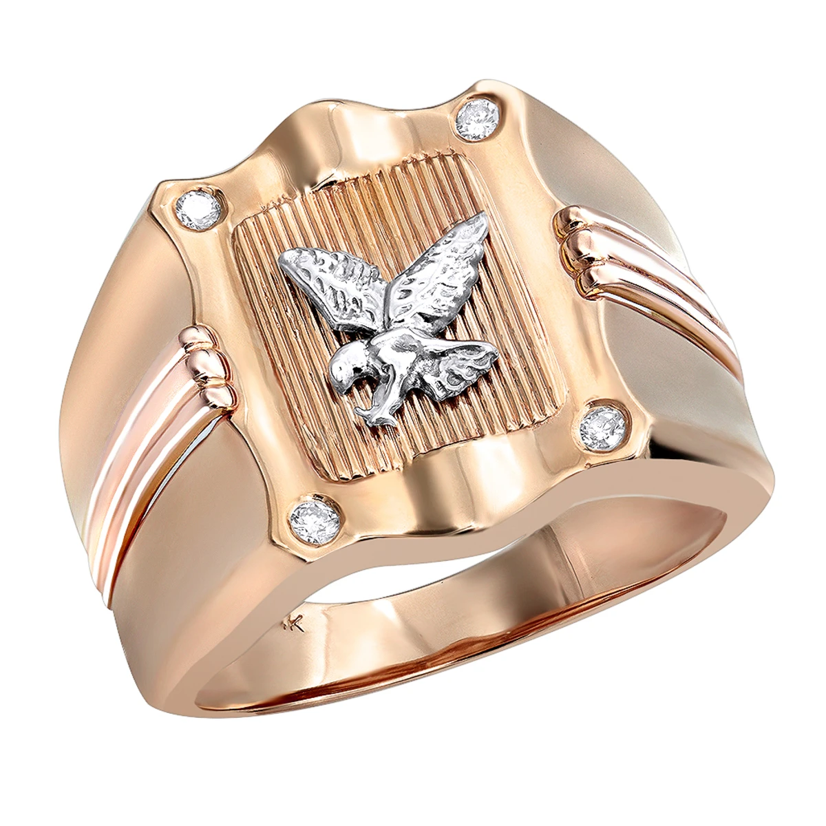 This fantastic 14 Karat Yellow Rose Gold Diamond Men’s Eagle Ring showcases 0.10 ctw of sparkling round diamonds, each masterfully set in a lustrous 14K gold frame. Featuring an intricate design and a highly polished gold finish, this 2-tone yellow and rose gold diamond men’s eagle ring is available in 14 Karat white, yellow and rose gold.