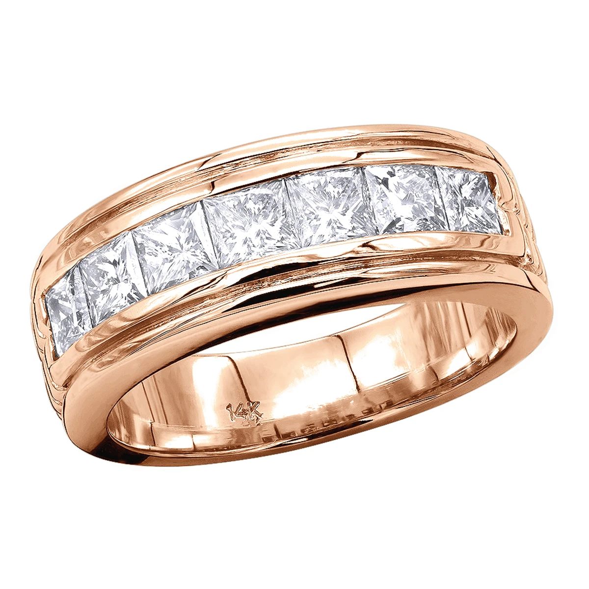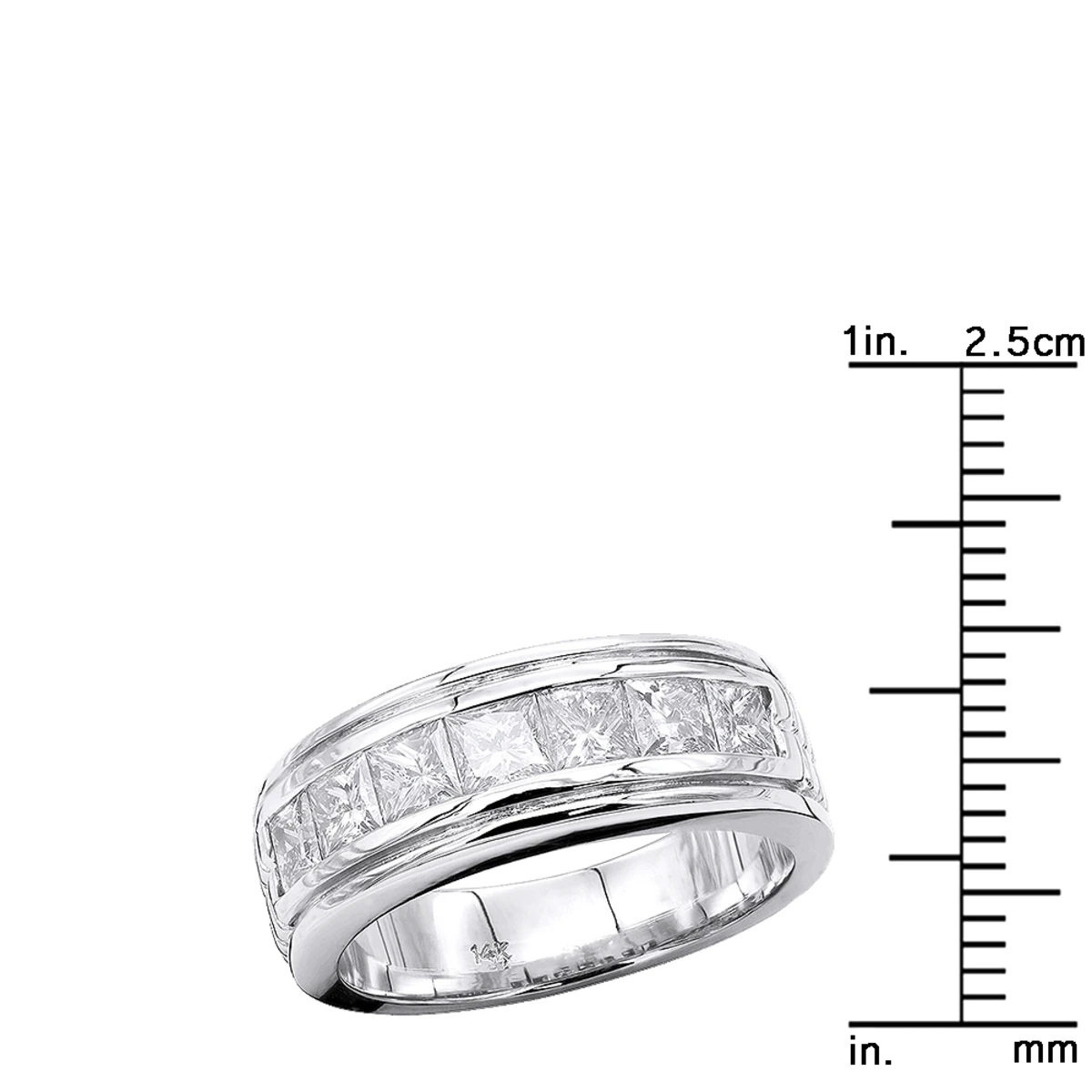 This Diamond Men’s Wedding Ring features 2.10 carats of princess cut diamonds (7 diamonds). This diamond wedding ring is available in Platinum, 18k or 14k yellow, rose, white gold, various sizes, and can be customized with any color and quality diamonds. Please note: it will take us 3-5 business days to make this ring for you so please plan accordingly. Please contact us at 212-398-3123 if your size or desired option is not listed.