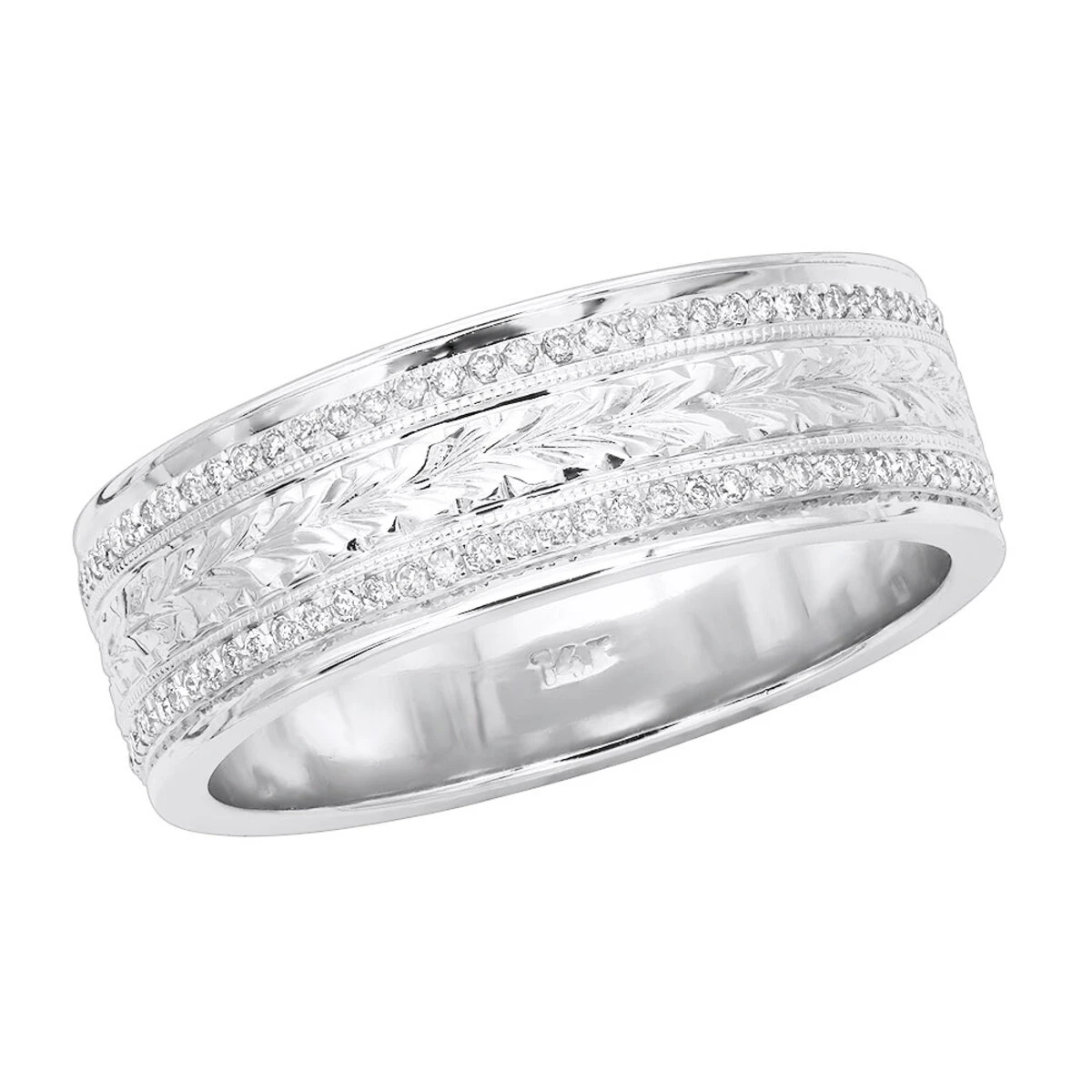14K White Gold Eternity Diamond Wedding Band For Men & Women Unique Ornamented Ring