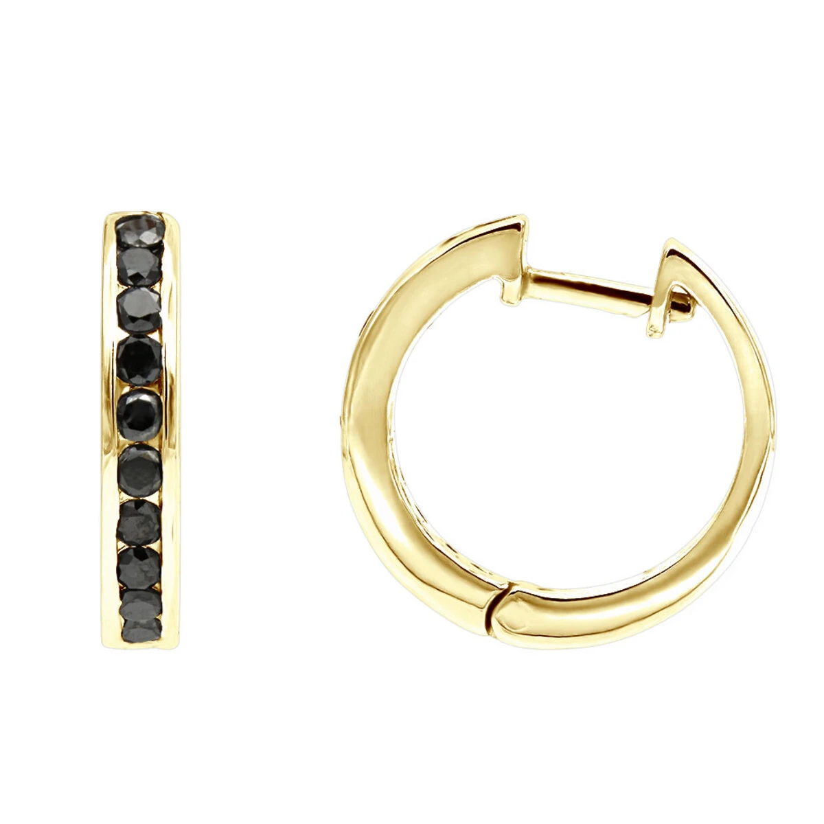 These attractive 14K Gold Hoop Huggie Black Diamond Earrings For Women are showcasing a classic huggie earring shape and are decorated with black round diamonds. This pair presents a perfect balance of refined femininity and industrial modernity. Featuring a stylish design with a highly polished gold finish, these exquisite black diamond huggie earrings are available in 14K white gold, yellow gold and rose gold and will make a perfect gift for any occasion. Each earring is 5/8in. (15mm) long and 1/8in. (3mm) wide so this pair is just the right size for most ears!