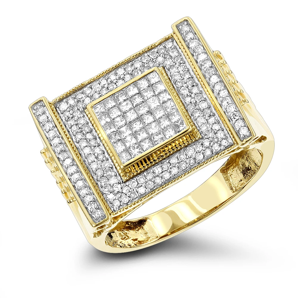 This exquisite 14K Gold Men’s Diamond Ring with Round & Princess cut diamonds weighs approximately 9 grams and displays 1.8 carats of sparkling invisibly and pave set diamonds. Featuring a classic square-shaped design and a highly polished gold finish, this men’s diamond ring is available in 14K white, yellow and rose gold.
