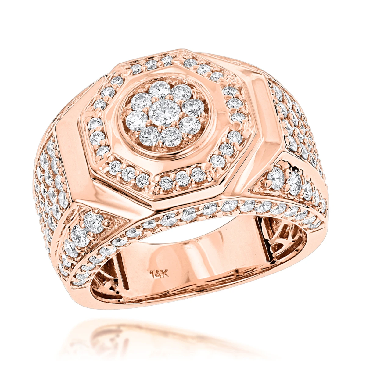 This architecturally-designed 14K gold pave set men’s diamond ring shines with its 3.42 ctw of full-cut round diamonds. This exquisite men’s diamond ring features a fine gallery back and can be worn as a one of a kind diamond wedding band.