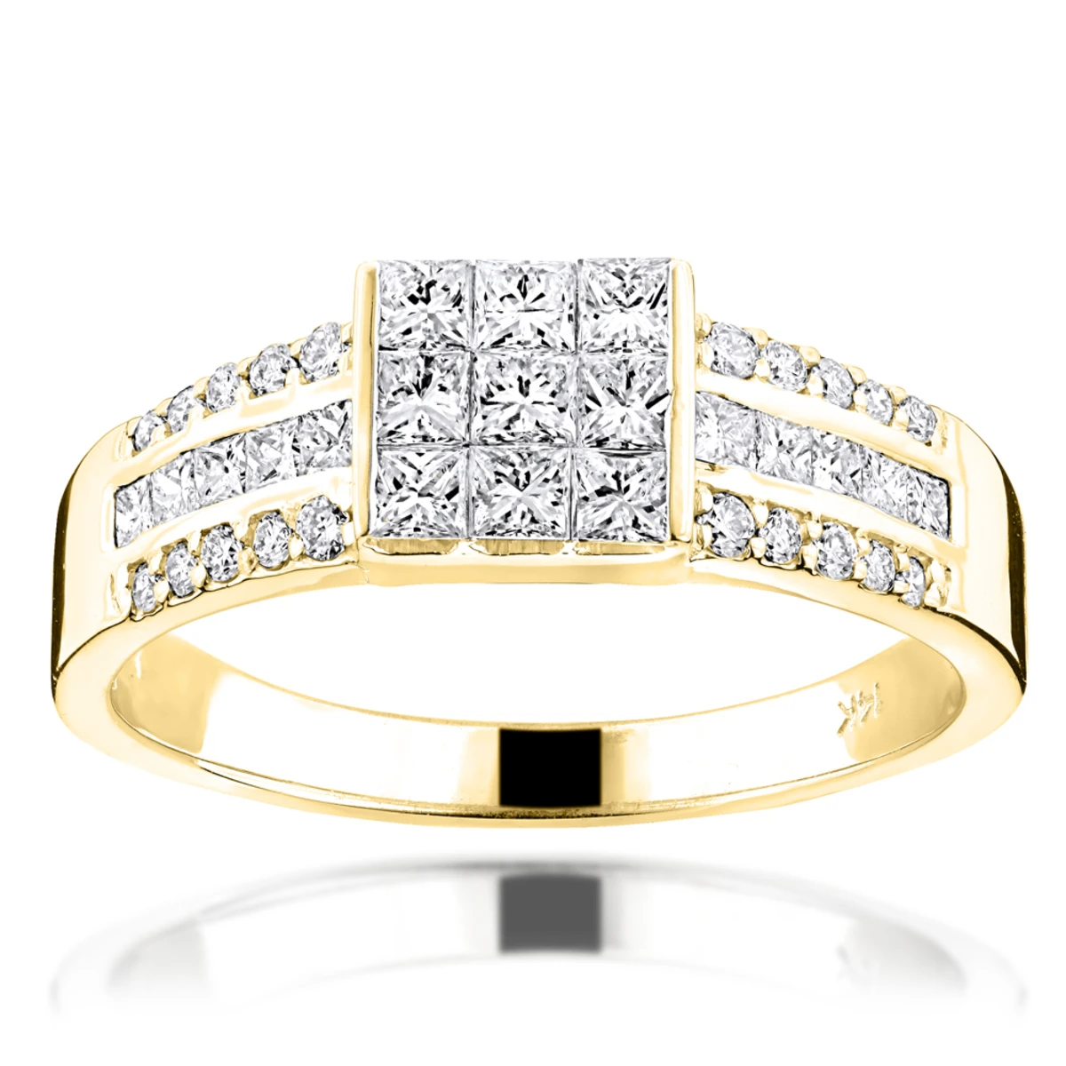 This exquisite 14K Gold Round Princess Cut Diamond Ring makes a unique wedding band and showcases 1.25 carats of sparkling invisibly & channel set princess cut diamonds and prong set round diamonds. Featuring a classic design and a highly polished gold finish, this unisex diamond wedding ring is available in 14K white, yellow and rose gold.