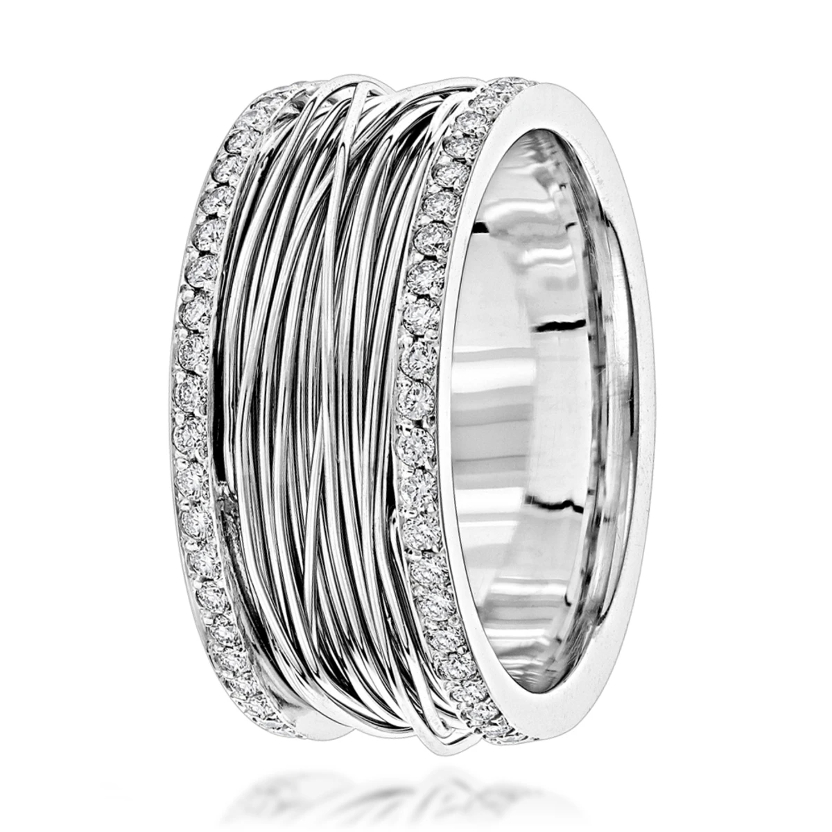 This Unisex Diamond Wedding Ring has a unique design of 14k Gold wire going around the center of the ring. This amazing diamond wedding band showcases 1 carat of dazzling G/VS quality round cut sparkling diamonds and is perfect band for men and women looking for a very unique yet classy wedding ring for their most special day!