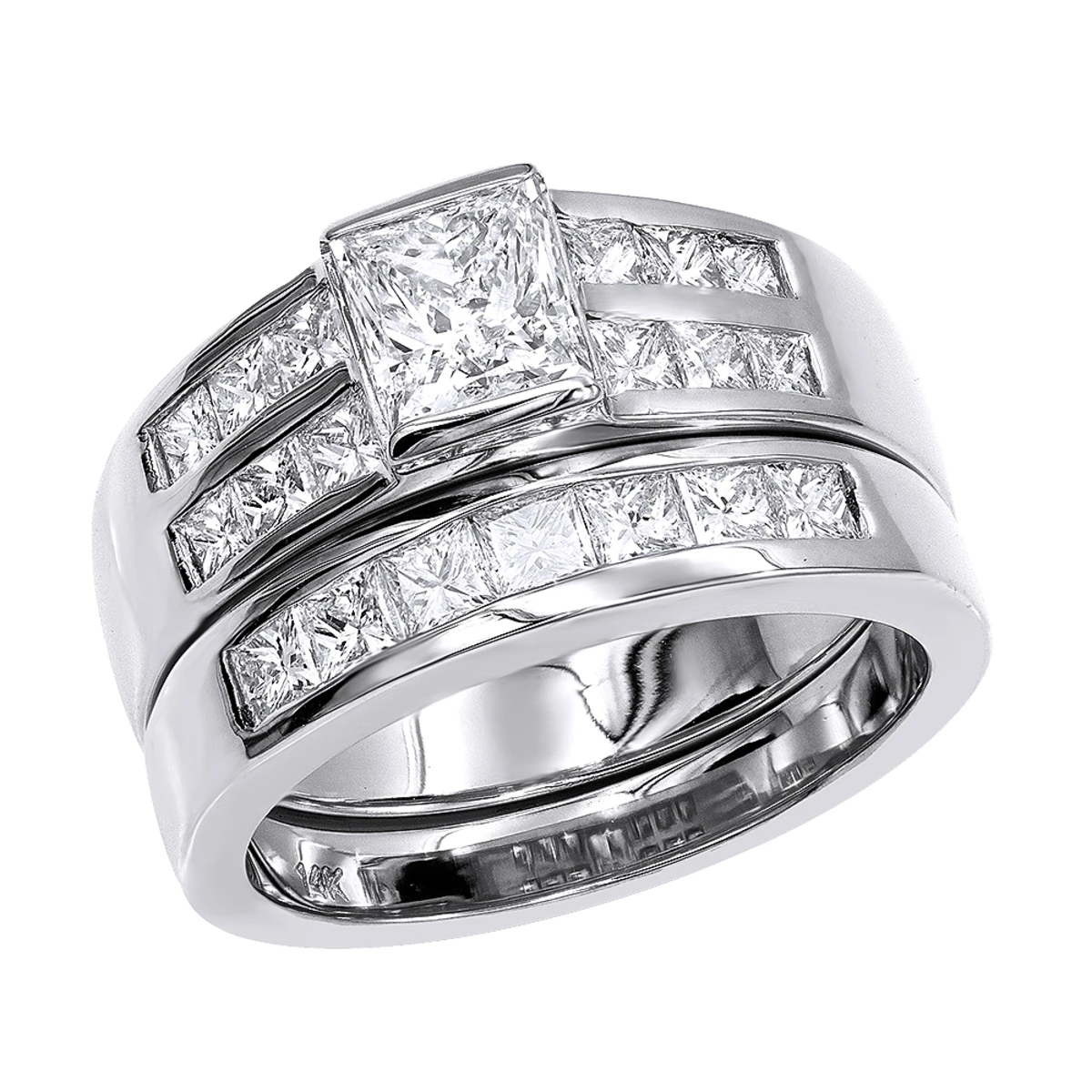 This Designer 14K Gold 2 Carat Princess Cut Diamond Engagement Ring and Wedding Band Set by Luxurman consists of an amazing princess cut diamond engagement ring and a beautiful matching diamond wedding band. The engagement ring showcases a 1 carat sparkling princess cut central stone in the middle and 0.6 carats of dazzling princess cut diamonds on the sides, the band showcases 0.45 carats of dazzling princess cut diamonds masterfully channel set in your choice of highly polished 14K yellow, white or rose gold. The set is also available separately as well as can be custom made in 18k gold and Platinum. Please contact us for details!
