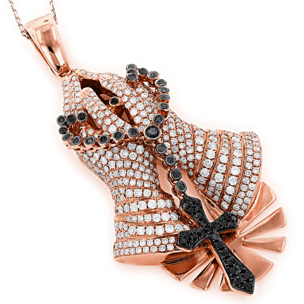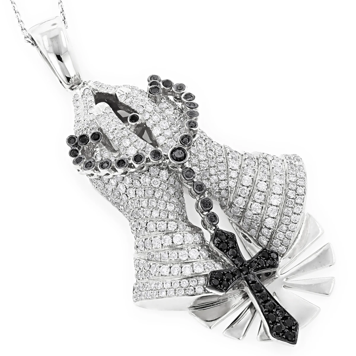 Religious Jewelry: This Unique 14K Diamond Praying Hands Pendant with Rosary and Cross weighs approximately 19 grams and showcases 6.29 carats of dazzling white and fancy black diamonds. Featuring an intricate design and a highly detailed work with attention to smallest detail, this praying hands diamond pendant for men depicts two hands in a prayer with a rosary paved in black diamonds, the rosary and cross move separately from the hands. This very unique men’s diamond pendant is available in 14K white, yellow and rose gold. Please note: the chain is for illustration purposes only and must be purchased separately. You also can personalize this piece or check we’ve already made and create your own design.