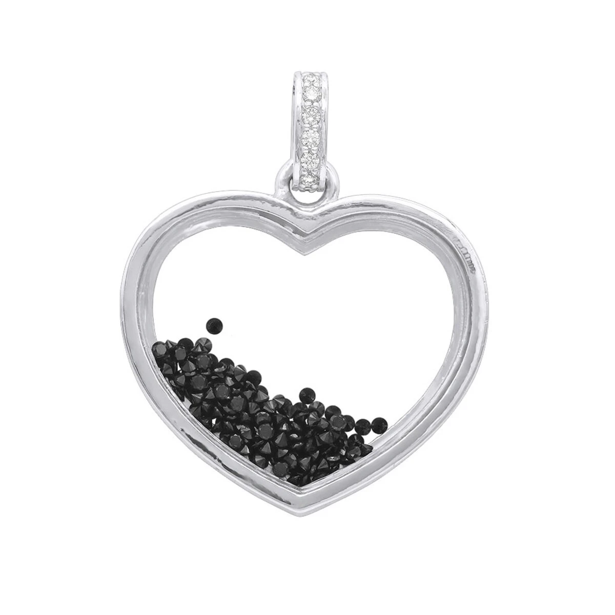From our ladies diamond heart pendants collection This deeply feminine and very unique 8 Carat White & Black Diamond Heart Shaker Pendant for Women in 14K Gold features sparkling white diamonds pave set on the outside of the pendant strikingly contrasted with freely moving black diamonds scattered on the inside behind the glass. This amazing moving diamonds heart pendant is available in 14K white, yellow or rose gold and you can be sure that every gold color will intensify the pendant’s remarkable scintillation. This beautiful shaker pendant appears almost alive as the numerous black diamonds shadow each subtle movement of it’s wearer. Inspired by the radiance of 2 contrasting diamond colors, our jewelers created a very unique jewelry piece expertly crafted to meet the highest industry standards. The pendant is quite large at 1 7/16in. (47mm) long (with bail), 1 9/16in. (39mm) wide and will suit even a most tempted jewelry connoisseur due to it’s fabulous one of a kind design. You also can personalize this piece or check we’ve already made and create your own design.