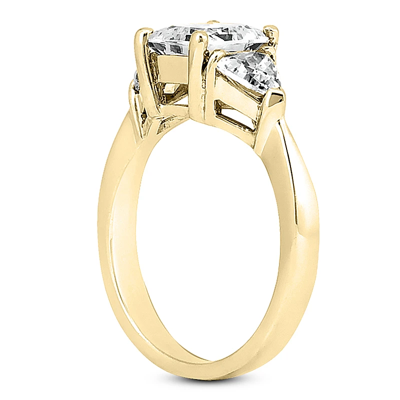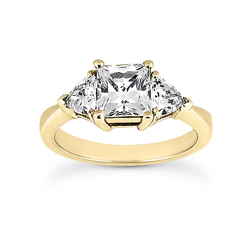 This 18K Gold Diamond Three Stones Engagement Ring Set consists of a diamond engagement ring and matching band. The engagement ring showcases a 0.40 carat princess cut diamond in the center and 0.30 carat of trillion cut diamonds on the sides for a total of 0.70 carat of dazzling diamonds. This set is available in Platinum, 18k or 14k yellow, rose, white gold, various sizes, and can be customized with any color and quality diamonds. Please contact us if you would like to customize it.