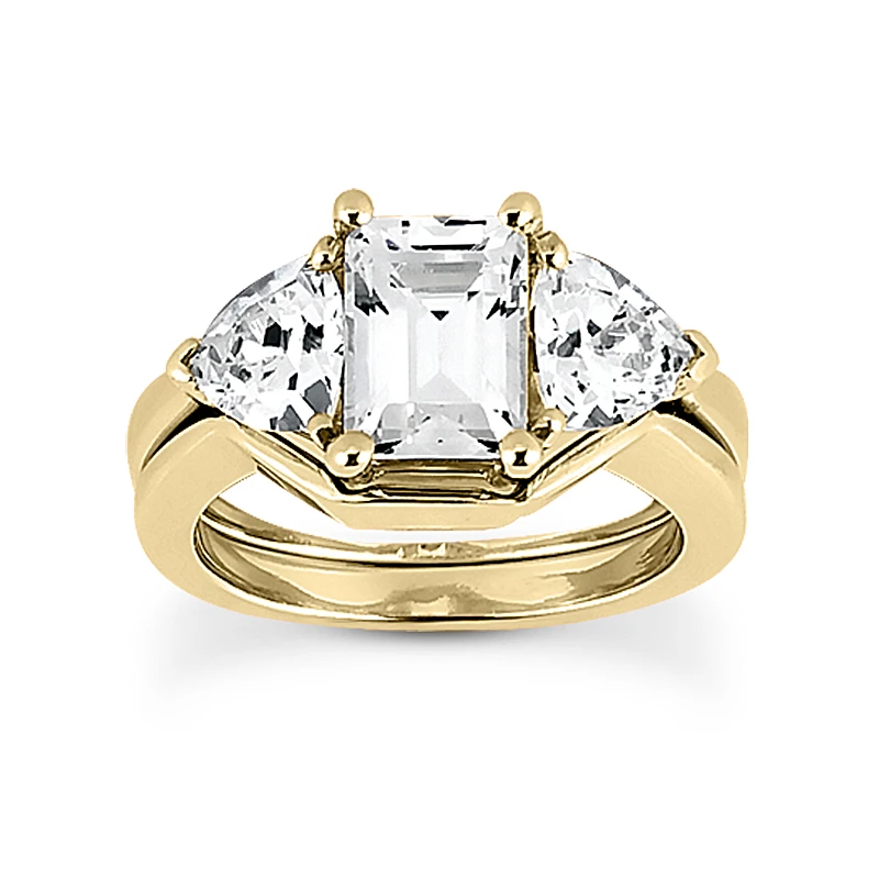 This 18K Gold Diamond Engagement Ring Set consists of a diamond engagement ring and matching band. The engagement ring showcases a 0.75 carat emerald cut diamond in the center and 0.40 carats of trillion cut diamonds on the sides for a total of 1.15 carats of dazzling diamonds. The band weighs approximately 3.9 grams. This set is available in Platinum, 18k or 14k yellow, rose, white gold, various sizes, and can be customized with any color and quality diamonds. Please contact us if you would like to customize it.