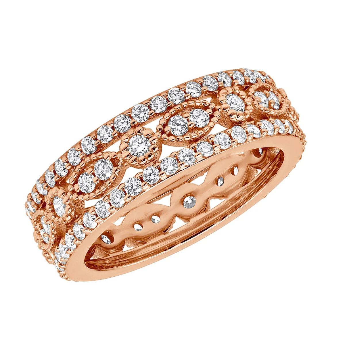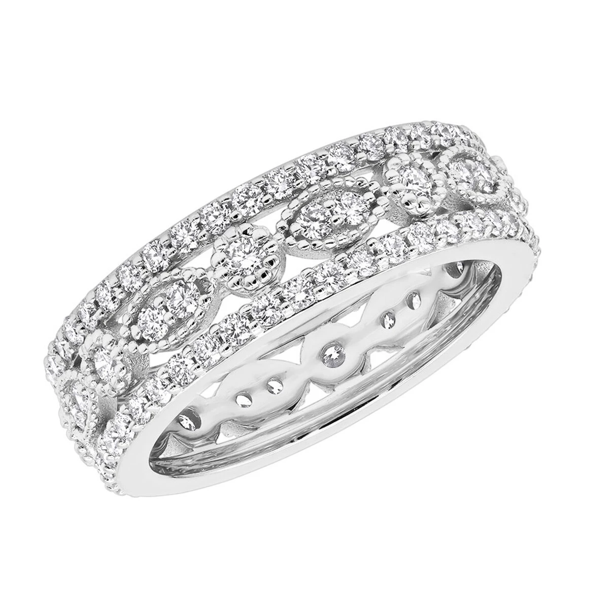 This luxurious 18K gold Tacori Style diamond full eternity ring features 1.81 carats of clear round cut diamonds and is available in lustrous 18K white, yellow and rose gold. Also available in a platinum diamond eternity ring design(please contact us for pricing details).