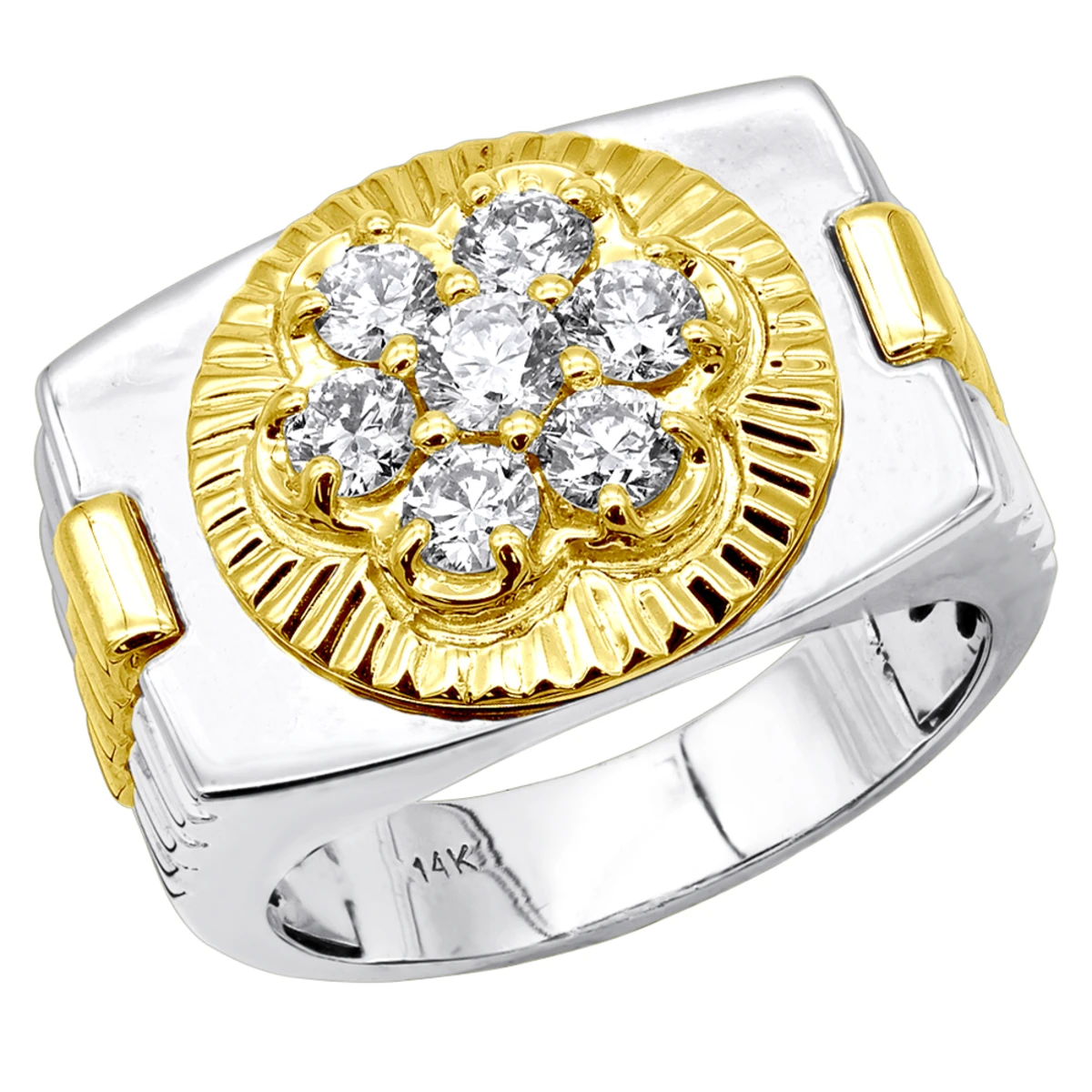 This 2 Tone Gold Rolex Style Men’s Diamond Ring in 14K gold showcases 1 carats of dazzling prong-set round diamonds. Featuring a 7-stone design and a highly polished gold finish, this men’s diamond ring makes a fabulous 7 year anniversary gift, and is available in 14K white, yellow and rose gold, as well as in 2-tone gold color combinations.