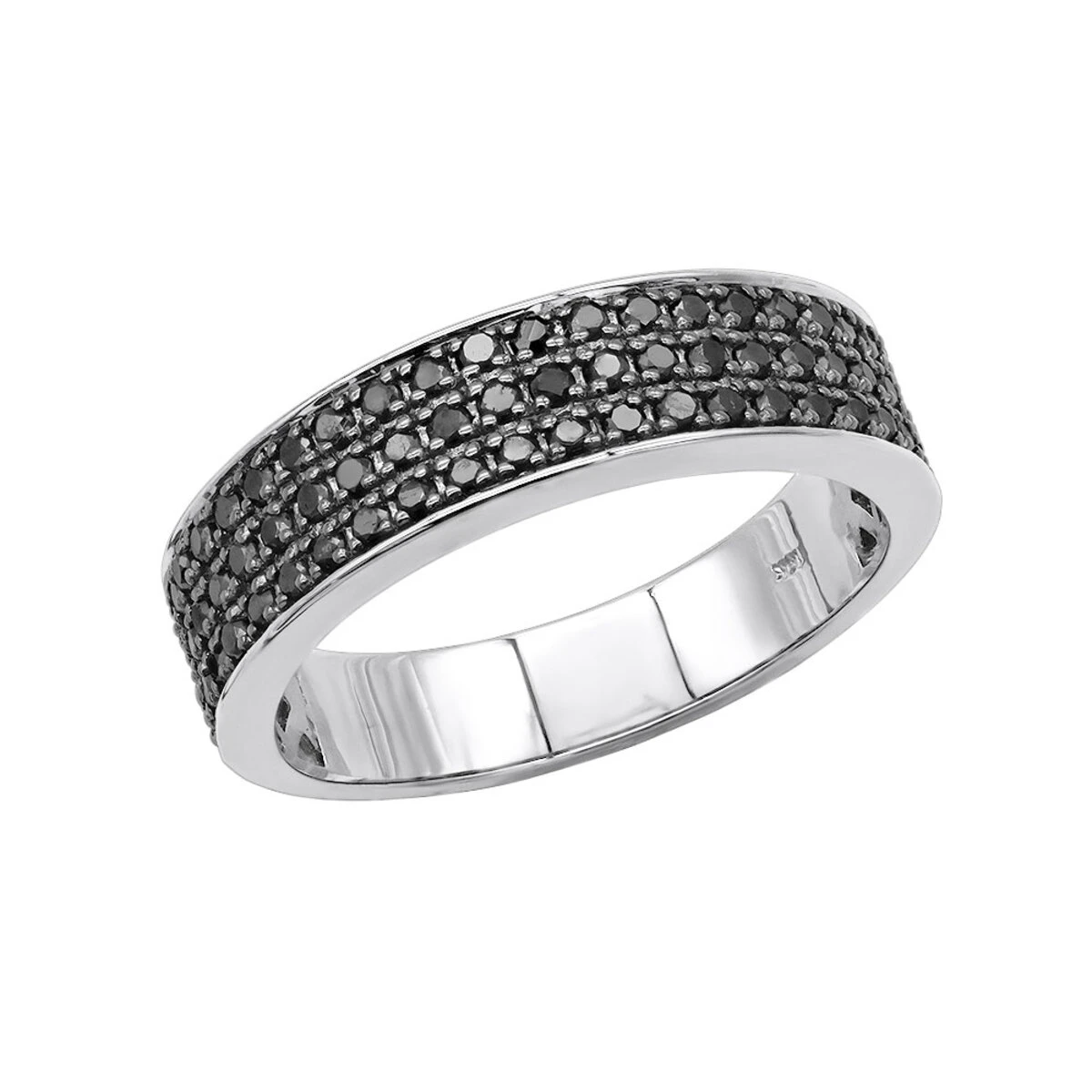 From our men’s diamond bands collection and anniversary rings This modern 3 Row 10K Gold Black Diamond Wedding Band for Men is made in solid 10k gold with option of a full black look with our black rhodium plating, the ring features clean lines and striking details. Measuring 1/4in. (6mm), it showcases an array of round cut black diamonds set in 3 long rows decorated with black rhodium plating. This ring is available in 10K white, yellow or rose gold and will be a show stopper in any color. For the most bold and stylish look, you can also choose this ring fully plated with black rhodium.