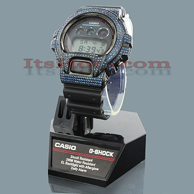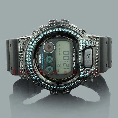 Unique Casio Watches! This G-Shock CZ Crystal Watch is based on the original DW6900 model. This G SHOCK watch features blue sparkling CZ crystals around the bezel, a black stainless steel case, a black rubber band and a digital dial code. This Casio G Shock watch is water-resistant to 200m. A custom G-Shock Diamond Watch is a stylish addition to any wrist.