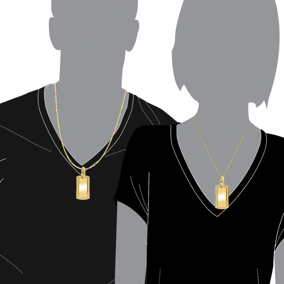 This fantastic 14K Gold Oversized Diamond Dog Tag Pendant for Men features a classic but larger than regular dog tag design, the pendant is 2 and a half inches long with bail and is decorated with 1 carat of sparkling round diamonds set it one row design around the pendant each prong set around the border and on the bail leaving the middle of this customizable dog tag open for a special design, engraving or a picture. All our dog tag pendants can be personalized with different color (canary yellow, blue, white or black) diamonds and engravings. Please contact us for details. This large men’s diamond dog tag pendant is available in white, yellow and rose gold. You also can personalize this piece or check we’ve already made and create your own design.