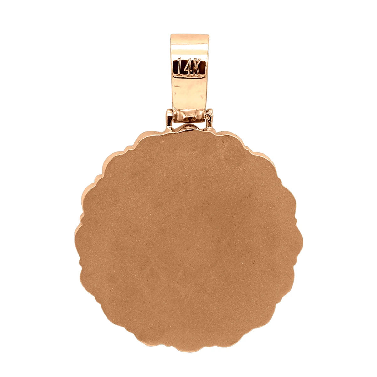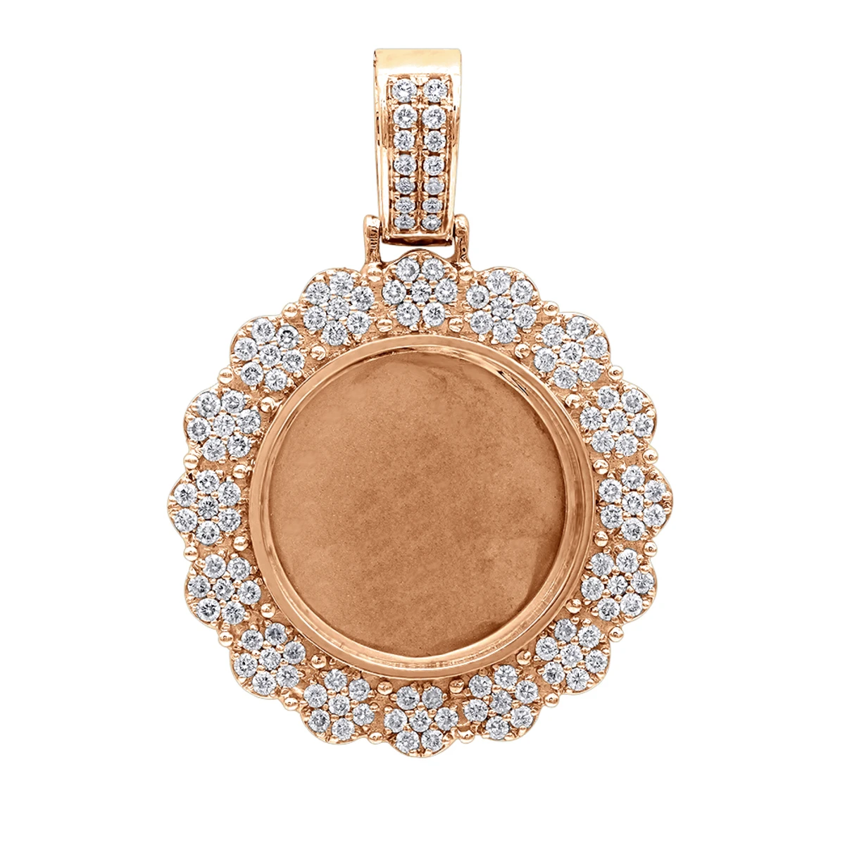 This Customizable Medallion Diamond Picture Pendant 1.52 Carats in solid 14K Gold showcases sparkling round cut diamonds masterfully set to form a flower frame around the middle part that is left blank for your unique decoration. Featuring an intricate design and a beautiful encrusted bail this medallion pendant is simply irresistible and will make any photo or engraving you choose look dazzling and unforgettable. The pendant is 1 2/8in. (31mm) wide, 1 5/8in. (44mm) long with the bail and is suitable for both men and women. It is available in 14K yellow, white and rose gold, includes beautiful packaging and makes a fabulous gift for a special memorable occasion. You also can personalize this piece or check we’ve already made and create your own design.