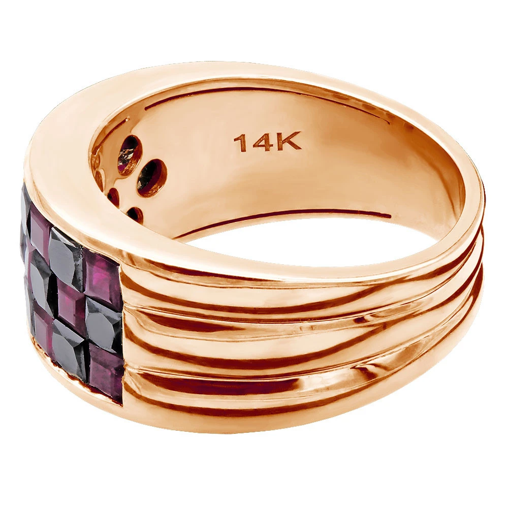 This customizable rubies and black diamonds ring for men and women in solid 14K Gold makes a unique band or anniversary ring and can be customized with black, yellow, red, white diamonds or gemstones. This unique ring is the perfect way to show your special someone how much you care. Crafted from 14k gold, it features a checkboard pattern with princess-cut rubies and princess-cut black diamonds. The rubies and diamonds are set in an invisible setting, giving the ring a sleek and sophisticated look. The total carat weight of the stones is 2.5, making this a truly eye-catching piece.The ring is available in both men’s and women’s sizes, so you can find the perfect fit for your special someone. The ring is also engravable, so you can add a special message or date to make it even more meaningful.This ring is a timeless piece that will be cherished for years to come. Whether you’re looking for an anniversary gift, a birthday present, or just a way to show your love, this customizable ring is the perfect choice. With its classic design and beautiful stones, it’s sure to make a lasting impression. Buy this unique ring as is or contact us to customize it further. Please note it will take us approximately 3 weeks to custom make this ring, so please plan accordingly.