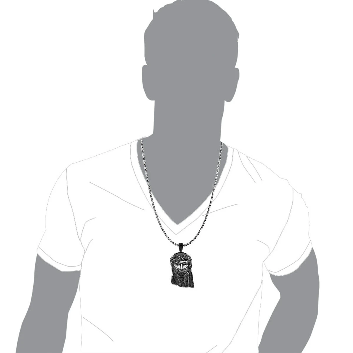 From our Jesus pendants collection: An array of captivating round black diamonds sit on the surface of this dramatic, vibrantly hued diamond Jesus pendant in solid sterling silver, which showcases the unique beauty of these dark diamonds, creating a mesmerizing jewelry piece. Masterfully cut and crafted, this striking Jesus head piece features a very detailed Jesus Head 3D design – you can see tears on the rhodium plated face, a beautiful crown of thorns meticulously encrusted with black diamonds and black diamonds in the piercing eyes. The bail is also fully iced out for a complete look. The pendant is featuring a highly polished finish and will be a perfect thoughtful present for any occasion. Please note: chain is for illustration purposes and must be purchased separately. You also can personalize this piece or check we’ve already made and create your own design.