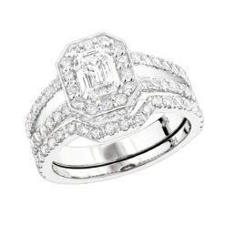 This Halo Emerald Diamond Engagement Ring Wedding Band Set in 14k Gold by Luxurman showcases 2.6 carats of diamonds masterfully set in 14K gold base. This diamond wedding ring set consists of an emerald diamond engagement ring and a perfectly matching diamond wedding band. Engagement ring features halo design, 1.2 carats of round diamonds surrounding beautiful one carat emerald cut center diamond. Matching band showcases 0.4 carats of round diamonds and curved design. This unique engagement ring set is available in 14K white gold, yellow gold and rose gold as well as 18K gold and Platinum as custom designs, and can be customized with different color clarity diamonds. Please call us if your desired option not listed – 212-398-3123. This item is made within 5-7 business days, please plan accordingly.