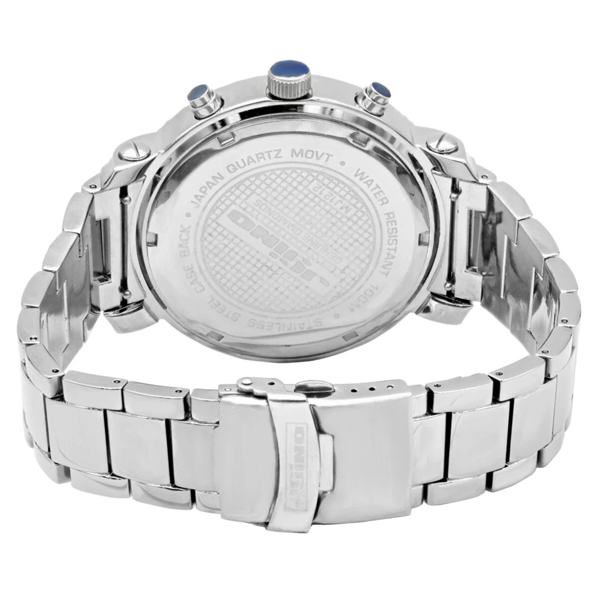 Men’s Chronograph Real Diamond Watch with 0.25 carats of white genuine diamonds. Oversized 52mm stainless steel case and stainless steel band. High quality Japanese quartz movement with Analog display, provide precise time keeping. 1 years manufacturer’s warranty by JoJino. 30 Days full return/exchange policy. Watches Ship out Insured with signature tracking from NYC Diamond District