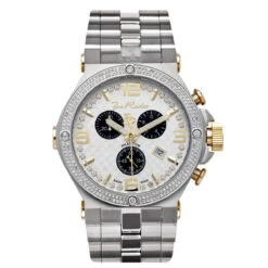 This JoJo Joe Rodeo Phantom Men’s Diamond Watch features 2.25 carats of genuine diamonds, a two-tone stainless steel case, scratch-free crystal glass and stainless steel band. This watch has two rows of white sparkling diamonds around the bezel with big diamonds at 3, 6, 9 and 12 o’clock position. This Joe Rodeo diamond watch also features brushed silver stainless steel dial with yellow gold tone hour markers and hands and a row of sparkling white stones around it. Super accurate Swiss-made quartz movement with chronograph function will keep the time for you. Water-resistant 100m (330 ft).