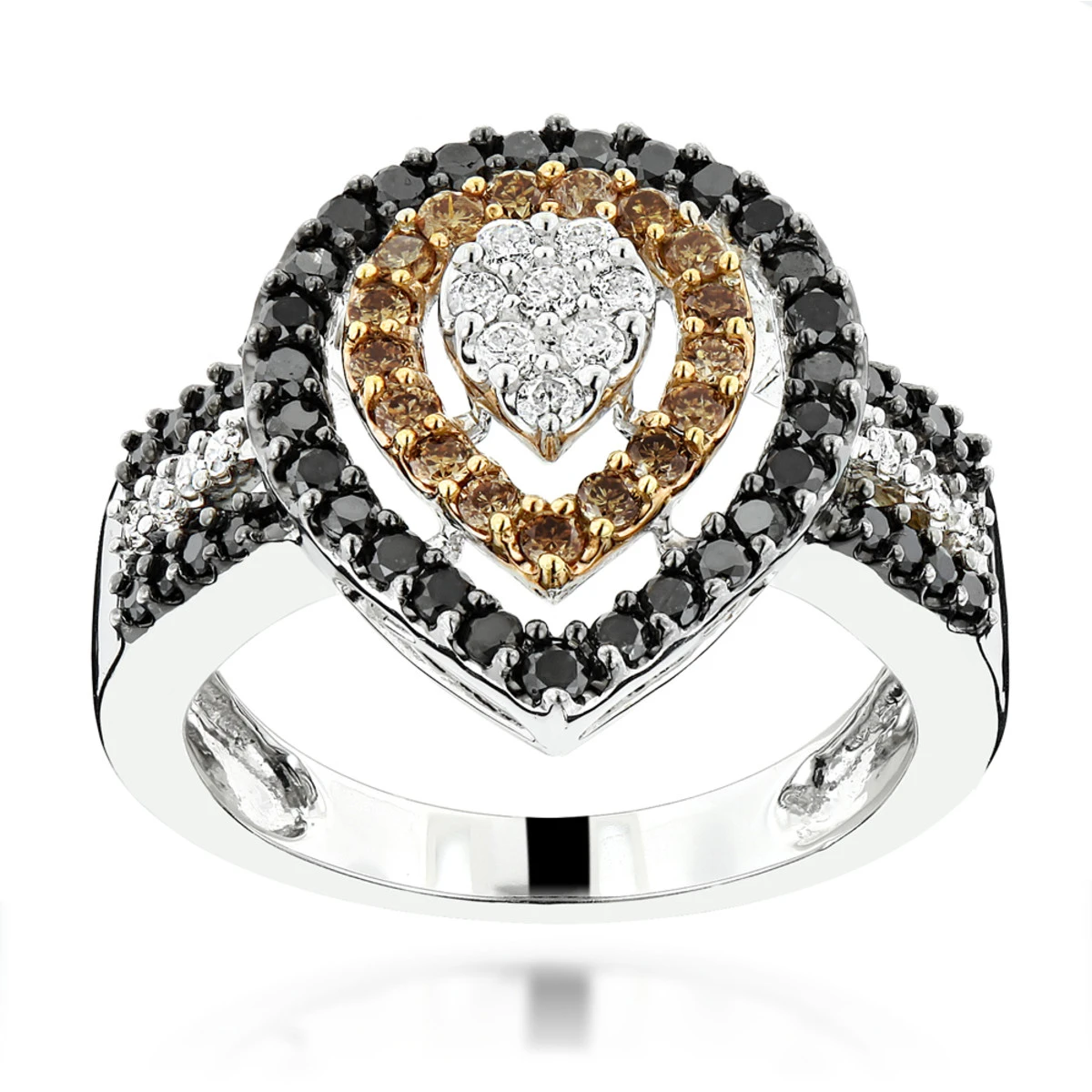 Ladies White Brown Black Diamond Ring 1.11ct 14K White Gold