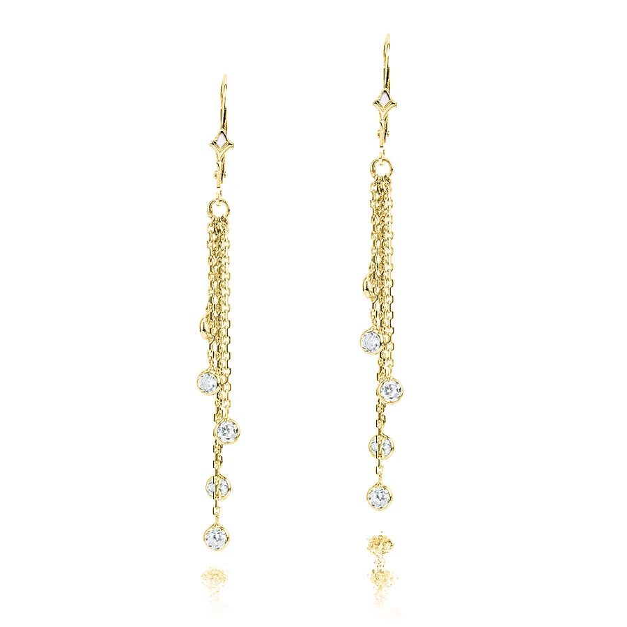 These exquisite Luxurman 14K Gold Chandelier Earrings With Diamonds By The Yard weigh approximately 2 grams and showcase 1 carat of dazzling round diamonds, each masterfully hand set in lustrous 14K gold. Featuring a simple yet elegant design and a highly polished gold finish, these women’s diamond earrings are available in 14K white gold, yellow gold and pink gold.