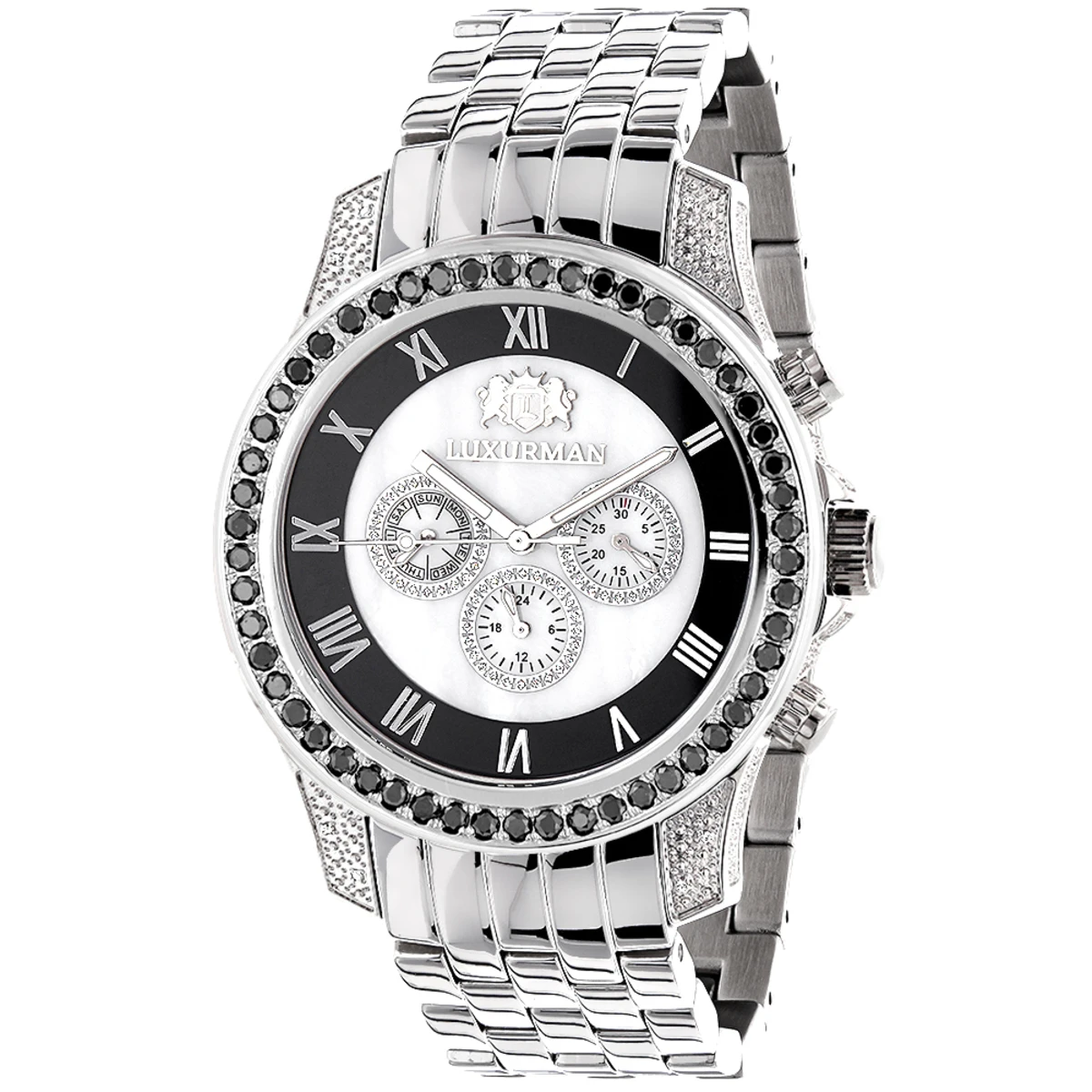 Luxurman Designer Watches: this Unique Men’s White & Black Diamond Watch by Luxurman showcases 3.25 carats of white and black diamonds. This Luxurman men’s diamond watch features a white face paved in white sparkling stones and three subdials, a silver tone stainless steel case and a polished silver tone stainless band. This diamond wrist watch is sized larger than an average watch and has a unique and classy look which will make you really stand out from the crowd.