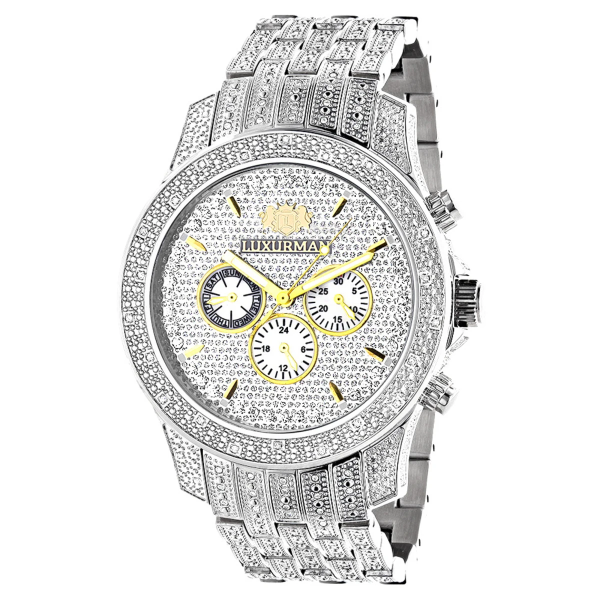 Exclusive Luxurman Men’s Watches! This Genuine Diamond Watch by LUXURMAN features 1.25 carats of round diamonds on the sides, lugs, bezel and the band of polished silver stainless steel case, and a yellow face with three chronograph subdials. This LUXURMAN diamond watch showcases a fine Japan-made quartz movement and is water-resistant to 30 m (110 ft). Luxurman watches are the most affordable designer diamond watches on the market!