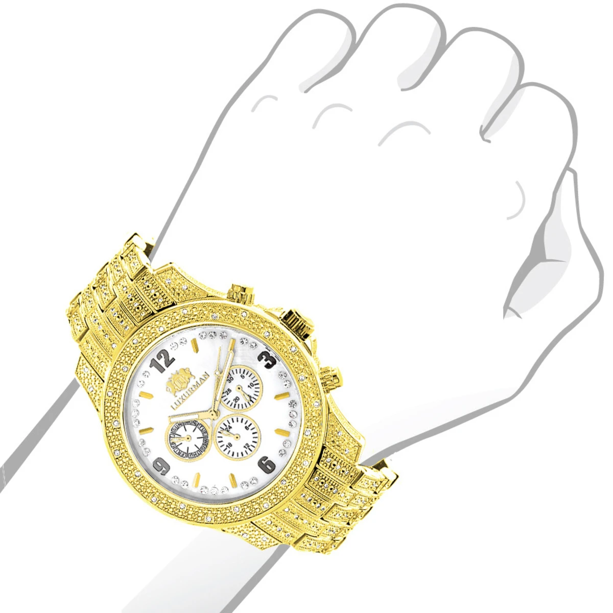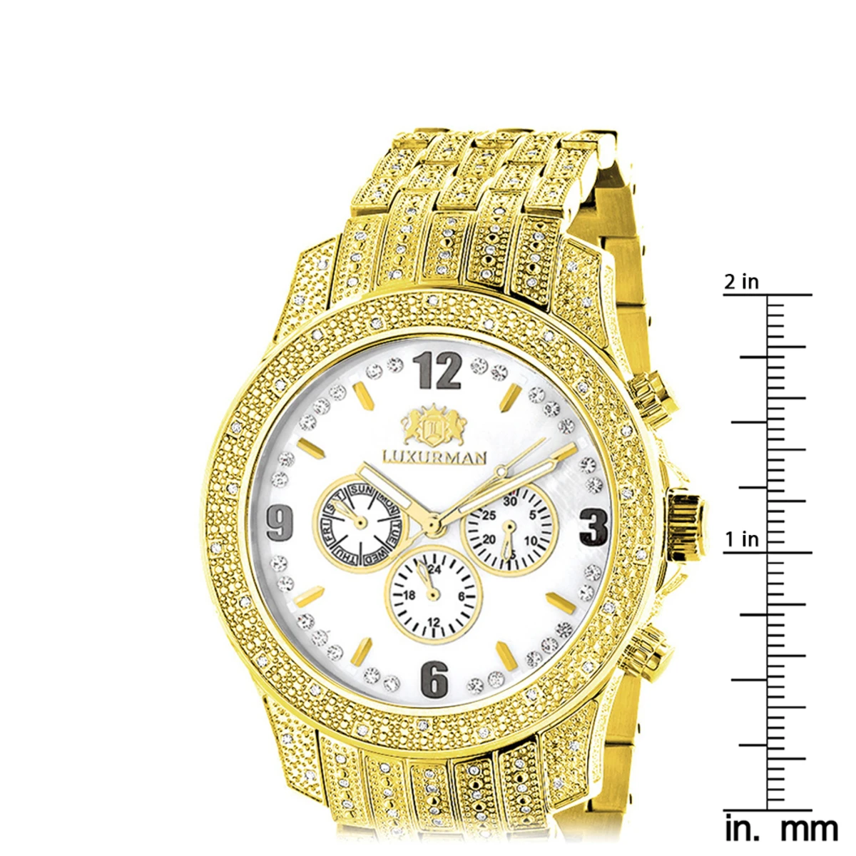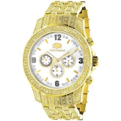 Handsome Luxurman Diamond Watches: This Men’s Real Diamond Watch by Luxurman is 18k yellow gold plated and showcases 1.25 carats of genuine diamonds on the sides, lugs, bezel and band of a polished yellow gold plated stainless steel case. Featuring a white mother of pearl face with three chronograph subdials and a date display, this luxurious men’s diamond watch by Luxurman houses a fine Japan-made quartz movement and is conveniently water-resistant to 30 m (110 ft).
