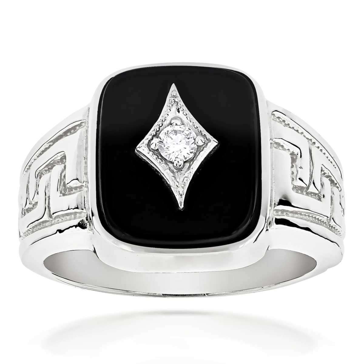 Luxurious Black Onyx and Diamond Rings! This 14K Gold Men’s Ring with Designer Band weighs approximately 8 grams and showcases a beautiful black onyx and a prong-set, 0.10-carat round diamond in the center. Featuring a highly polished and textured gold finish, this men’s black onyx and diamond ring is available in your choice of 14K white, yellow and rose gold, and makes a perfect gift for any occasion.