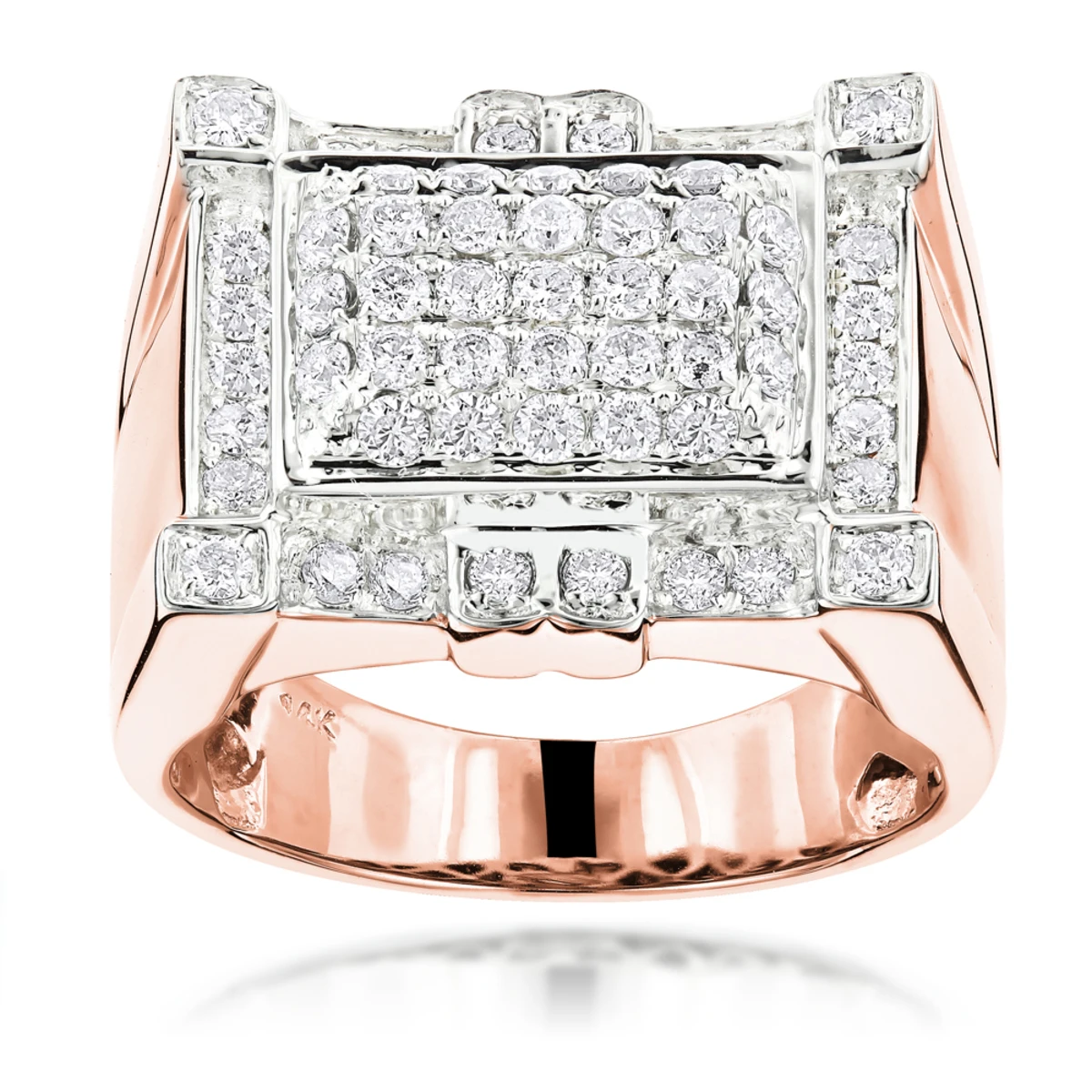 This Men’s Diamond Ring in 14K gold gold features unique design and weighs approximately 14 grams and showcases 1.55 carats of sparkling round diamonds. Featuring an intricate design and a highly polished gold finish, this men’s diamond ring is available in 14K white, yellow and rose gold.