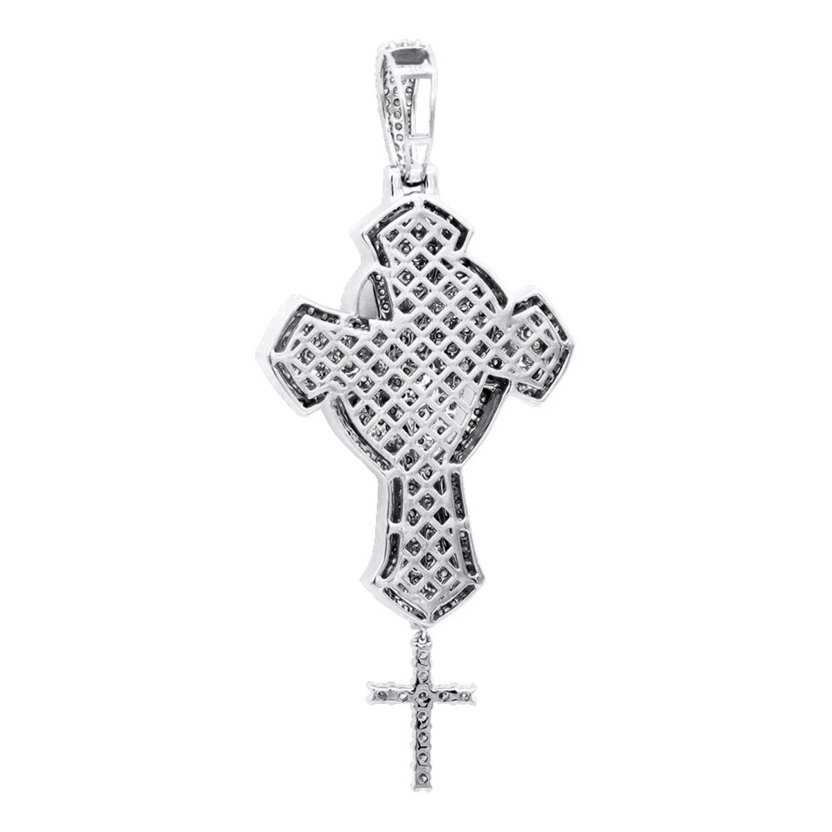From our relgious jewelry and men’s diamond crosses collections we present you this unique diamond cross pendant; make a bold statement with this Large Men’s Diamond Cross Pendant in solid 14K Gold decorated with 2.5 carats of genuine, sparkling diamonds. This huge and dazzling cross pendant (the pendant is just over 2.5 inches long in total length with bail) is a balance of true masculinity and industrial modernity. Glowing white round diamonds scattered all over the intricate composition with a diamond incrusted bail and a mini cross pendant hanging at the bottom of the main cross from a depicted rosary make this pendant very unique and with hundreds of diamonds irresistibly sparkling. This luxurious jewelry item was designed to be worn without any need for further jewels, just combine it with one of our men’s gold chains here https://www.itshot.com/jewelry/chains-necklaces/men’s-real-gold-chains and it will make a perfect necklace for an ambitious and stylish person. Available in white, yellow and rose 14K gold. You also can personalize this piece or check we’ve already made and create your own design.