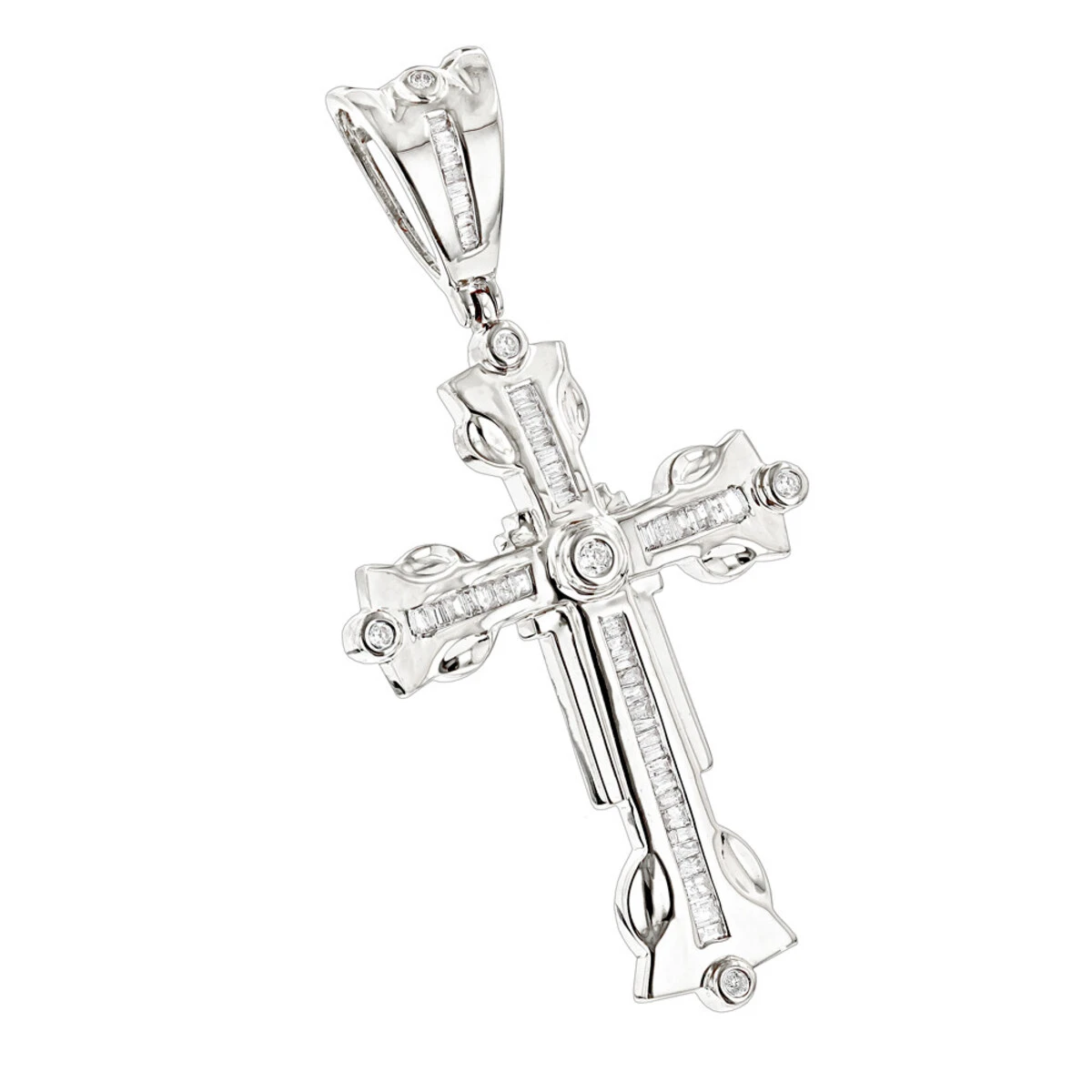 This Round Baguette Diamond Cross Pendant in 10K Gold weighs approximately 5 grams and showcases 0.5 carats of genuine diamonds. Featuring an intricate design and a highly polished gold finish. This men’s diamond cross pendant is available in 10K white, yellow and rose gold. Chain must be purchased separately. You also can personalize this piece or check we’ve already made and create your own design.