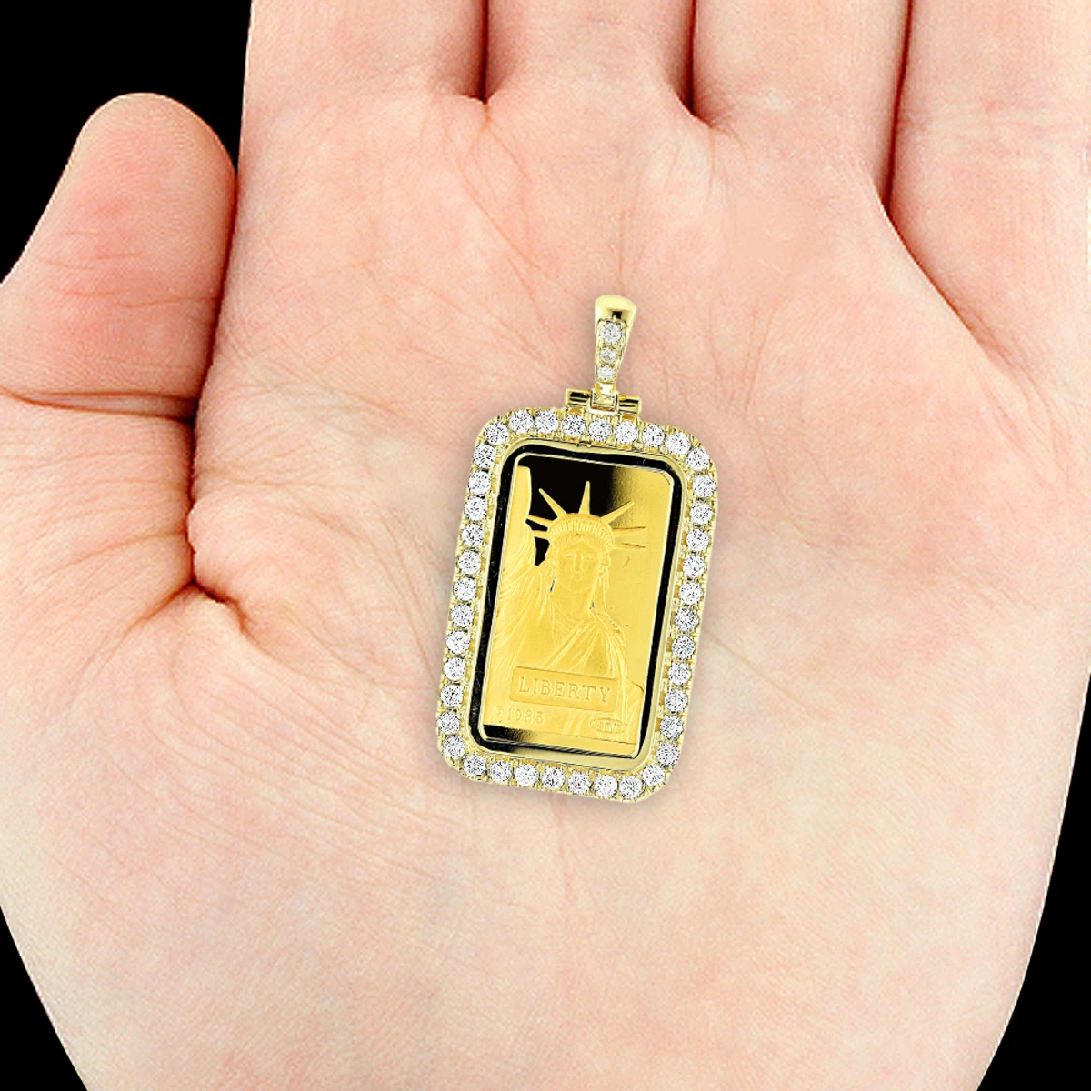 This Statue Of Liberty Diamond Pendant 2.2ct Credit Suisse Gold Bar Charm will make you look fabulous no matter where you are. This magnificent Credit Suisse Gold Bar diamond pendant weighs approximately 30 grams (about 20 grams of 24k and 10 grams of 14k gold) and is decorated with over 2 carats of stunning round diamonds. This custom made diamond pendant will make a luxurious present for that special someone. A chain for this diamond pendant must be purchased separately. Please note that due to scarce gold supply at this time Statue of Liberty Suisse Bar might not be available in which case same weight/value PAMP Suisse Lady Fortuna Bar will be offered instead. You also can personalize this piece or check we’ve already made and create your own design.