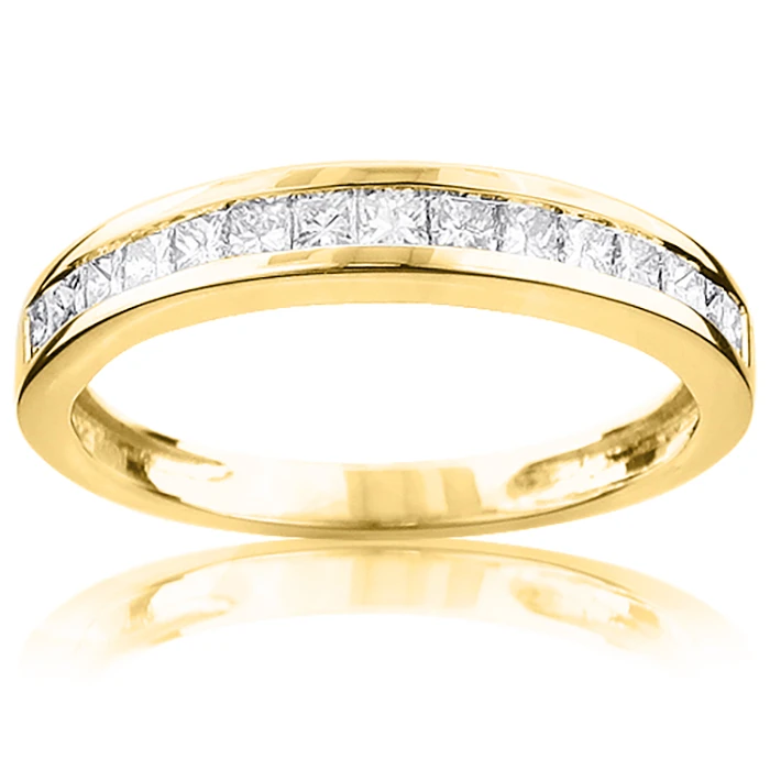 This Princess Cut Diamond Wedding Band in 14K gold showcases 0.59 carats of genuine diamonds. Featuring a classic design and a highly polished gold finish, this classic unisex wedding band is available in 14K white, yellow and rose gold.