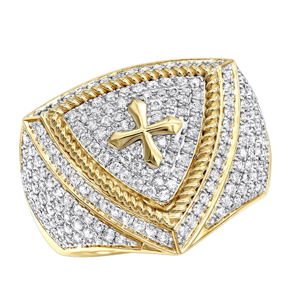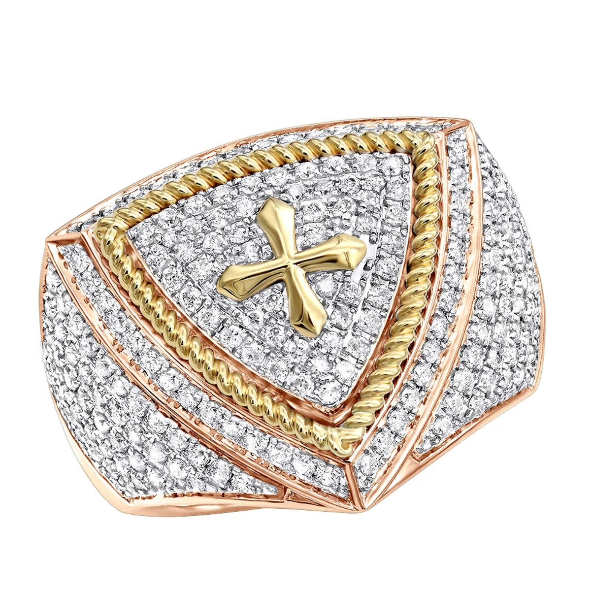 Luxurman Men’s Diamond Rings Collection: This unique two town gold Cross Diamond Ring for Men from ou latest collection features a trendy triangular design with unique touches, fully paved in 1.5 carats of shining diamonds and a cross prominently displayed in the middle; this men’s diamond cross ring is available in 14k two tone white gold, yellow gold and rose gold.