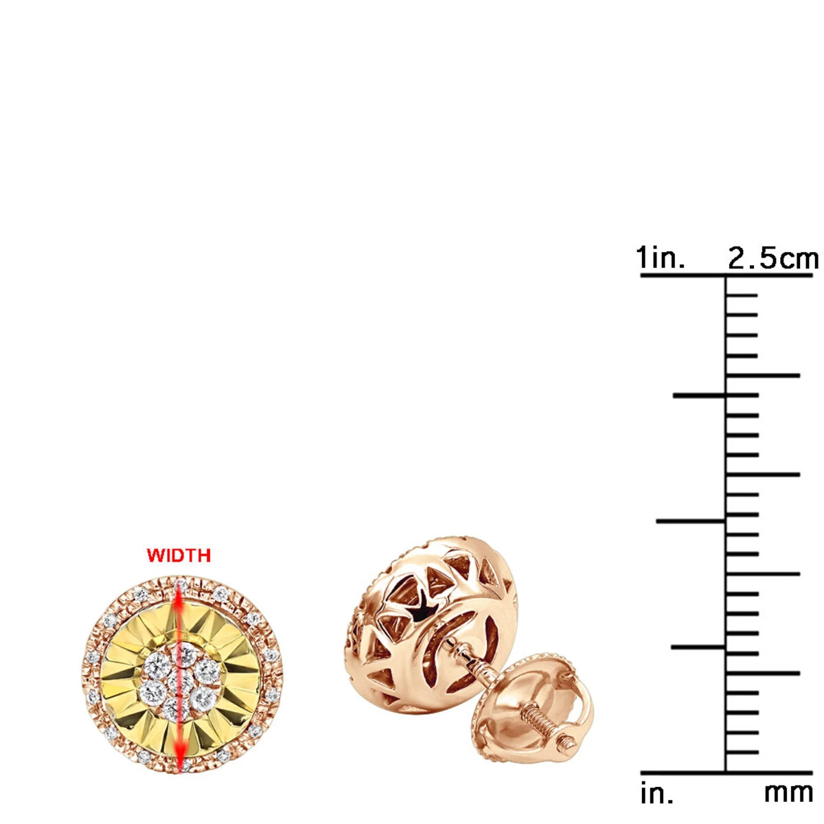 From our unique diamond earrings for men and women and diamond stud earrings collections These 14K Gold Affordable Diamond Earrings Studs are huge and have a look of earrings with 2 carat center diamond due to their unique diamond setting and showcases 0.2 carats of sparkling cluster set round diamonds in the middle and a halo setting on the outside around the earrings. Available in 14K white, yellow or rose gold, these lovely unisex diamond earrings design makes diamonds in the middle look wrapped in gold, and the halo with white round diamonds adds even more sparkle. The earrings weigh approximately 3.5 grams, feature secure screw-back closure and quite large at 3/8in (10mm) in diameter, they will make an affordable yet very nice addition to any jewelry collection.