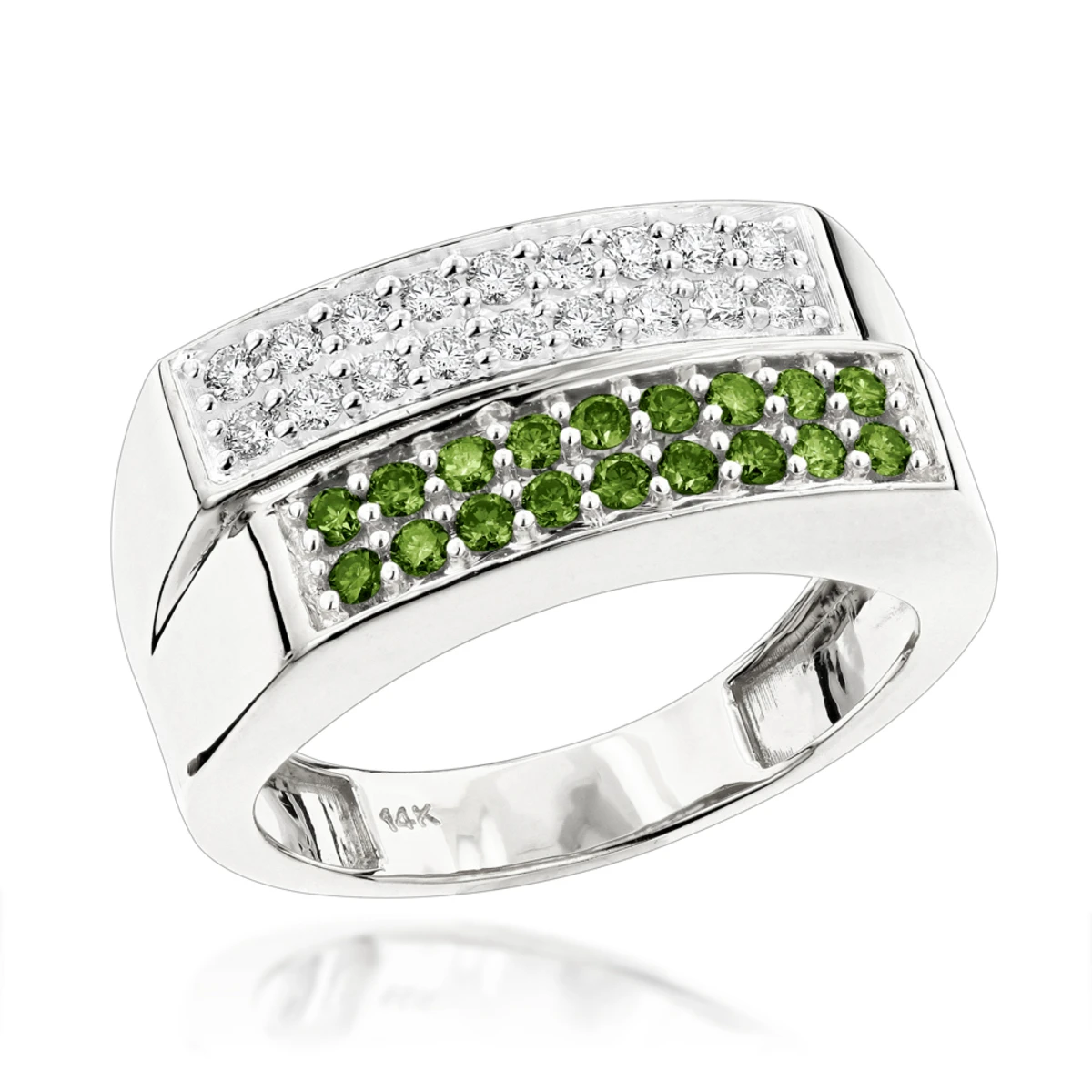 From our men’s diamond rings collection: This 14K White Green Diamond Ring for men weighs approximately 9 grams and showcases 1.1 carats of sparkling round diamonds. Featuring a gorgeous white and green diamond combination, and a highly polished gold finish, this men’s diamond ring is available in 14K white, yellow and rose gold.