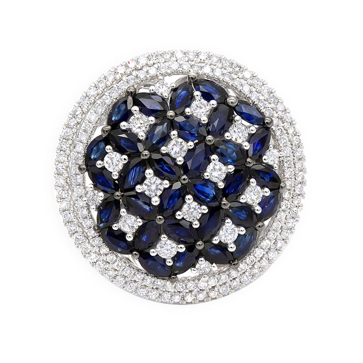 This Royal Halo Diamond and Sapphire Ring for Women by Luxurman showcases vintage yet classy round shape setting design accentuated with miracle combination of 3.5 carats shimmering round diamonds and marquise cut sapphire stones. This diamond right hand ring for women features diamonds and sapphires in the center of the ring playfully set into an ornament that reminds of stars in the sky of Arabian Nights and represents gracefulness and beauty. This ladies ring can be worn as a right hand ring as well as very unique engagement ring. The ring is pretty large at 22mm wide and is available in 14K Yellow, Rose and White gold. This beautiful piece of art will make the best gift ever!
