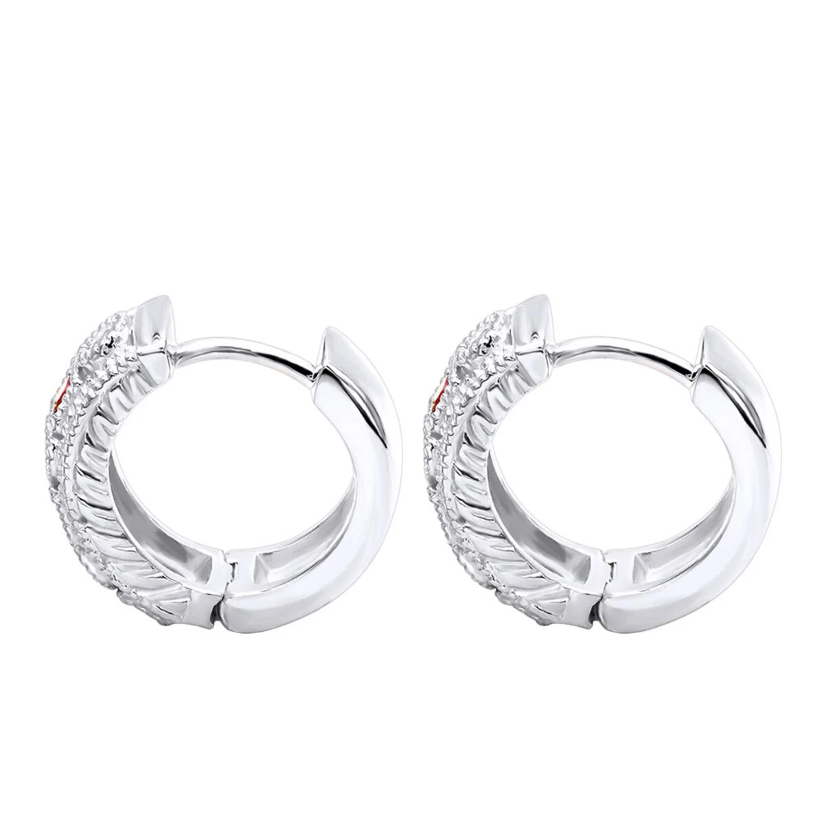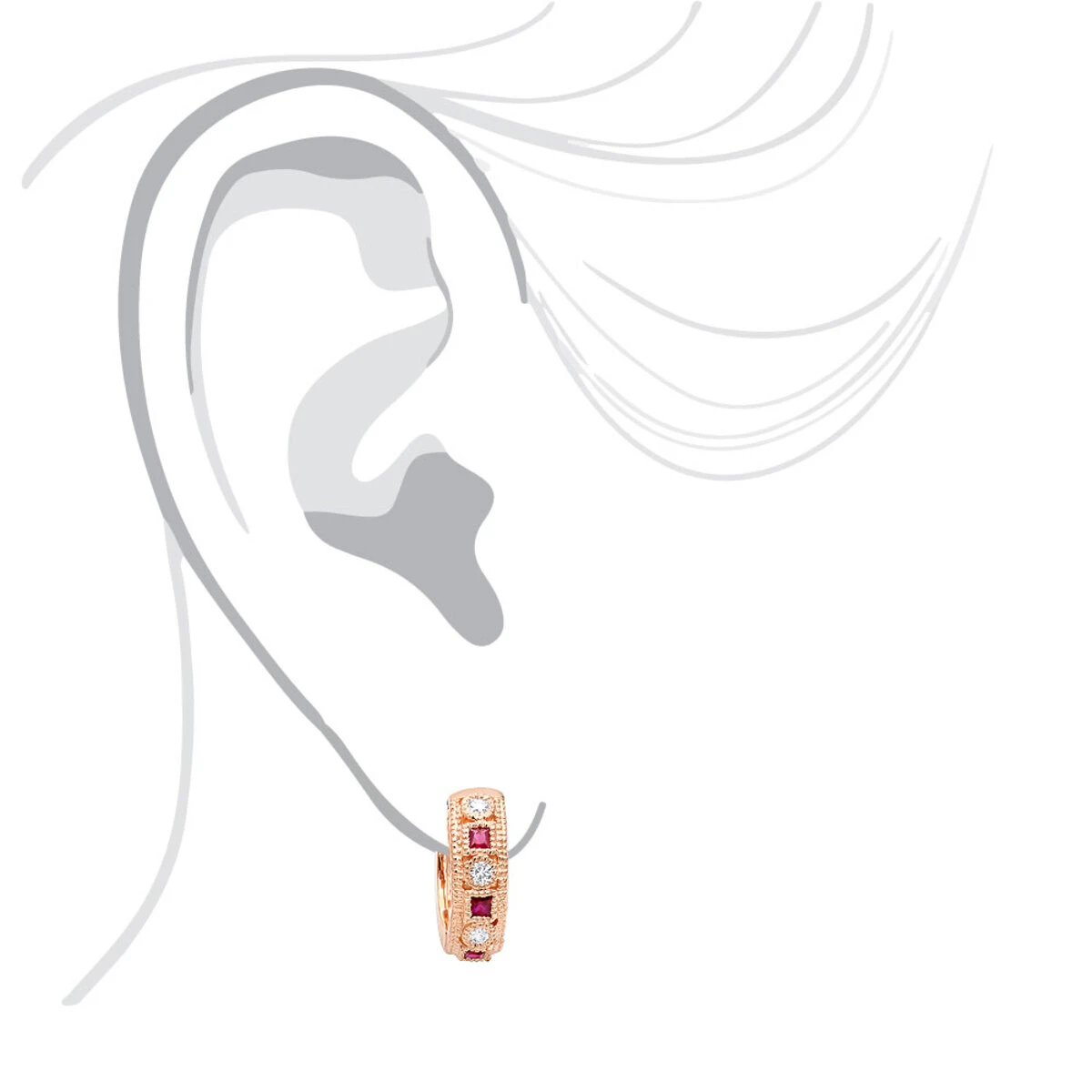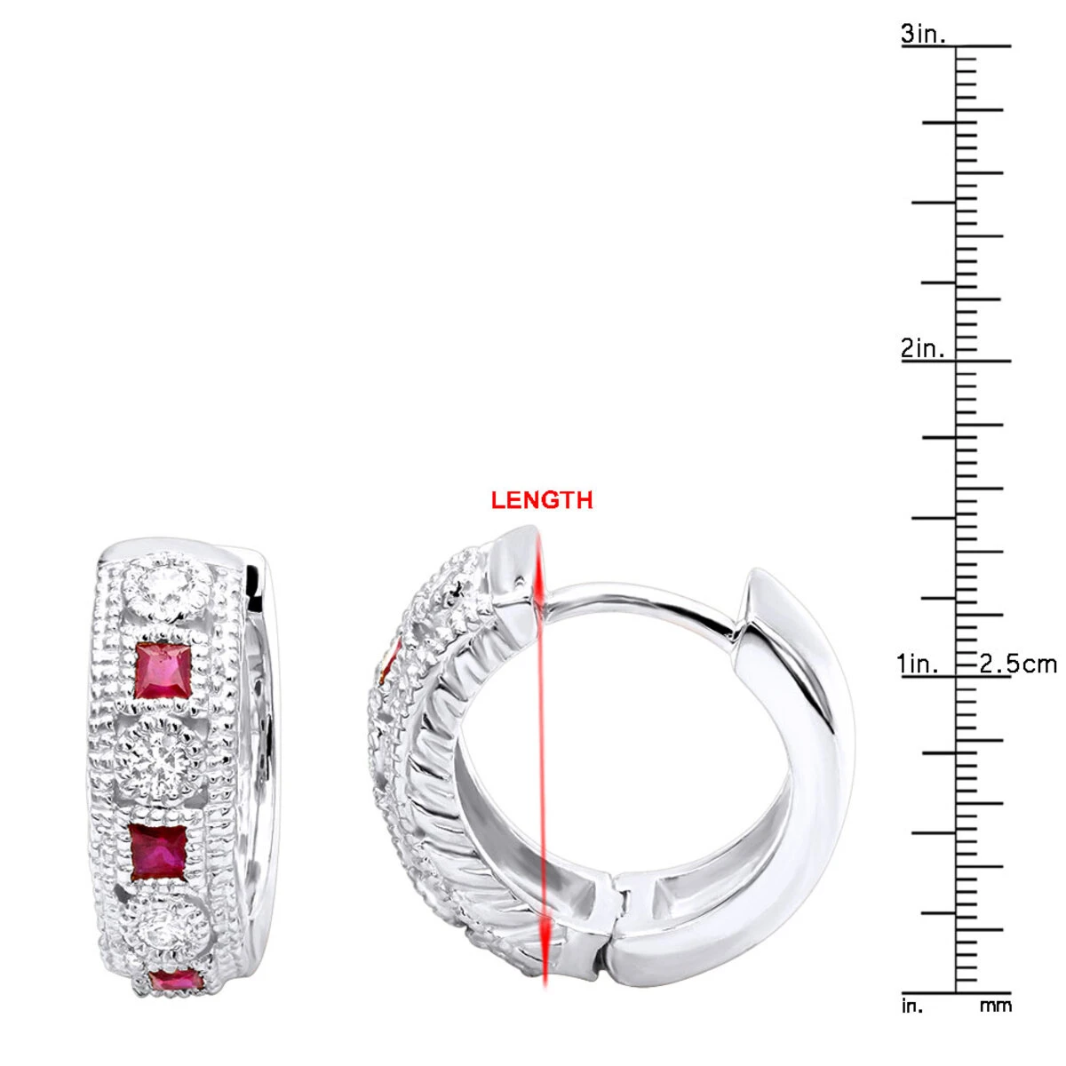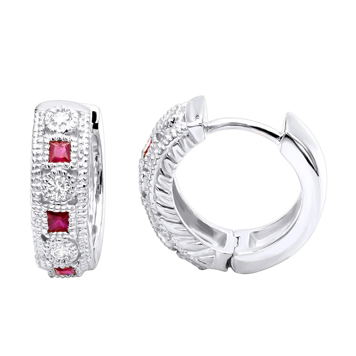From our diamond huggie earrings collection these diamond and rubies small hoop earrings are 1/2 inch long and showcase 0.5 carats of sparkling round white round diamonds and princess cut red rubies. Featuring a unique design and a highly polished gold finish with bead detailing, these exquisite diamond and ruby huggie earrings are available in 14K white, yellow and rose gold.