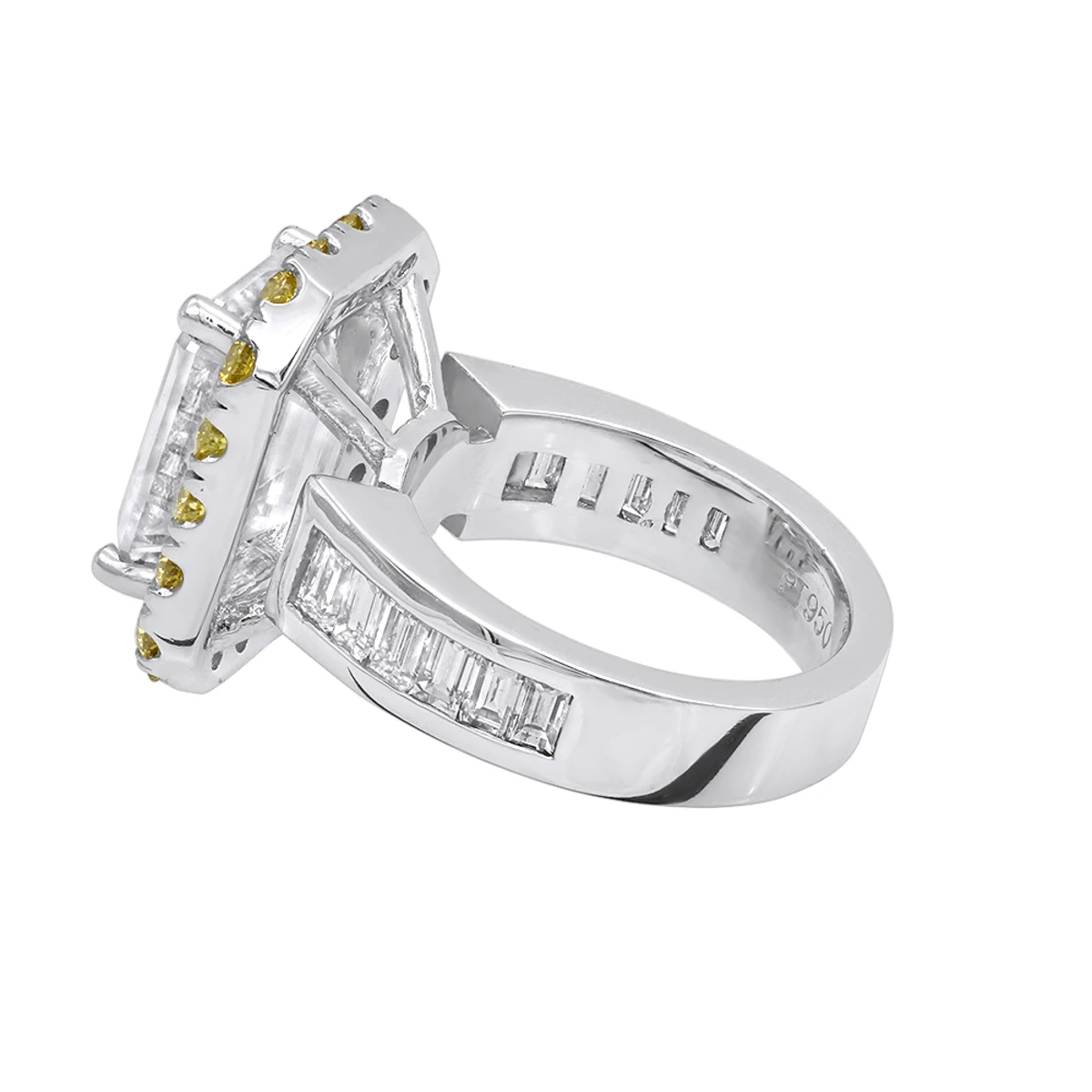 From our unique jewelry and diamond engagement rings collections this gorgeous and very unique large moissanite engagement ring in Platinum features 10x8mm D color VS clarity emerald cut moissanite stone with in the center with a halo made of round yellow diamonds, on two sides going down the platinum band we set white VS quality baguette diamonds for a perfect balance with the emerald moissanite in the center (total carat weight of diamonds is 2 1/2 carats). This diamond and moissanite ring is quite large about 5/8in. (17mm) wide and can also become a fantastic statement ring, a cocktail ring or a very unique engagement ring, it will definitely leave a long lasting impression in any role.