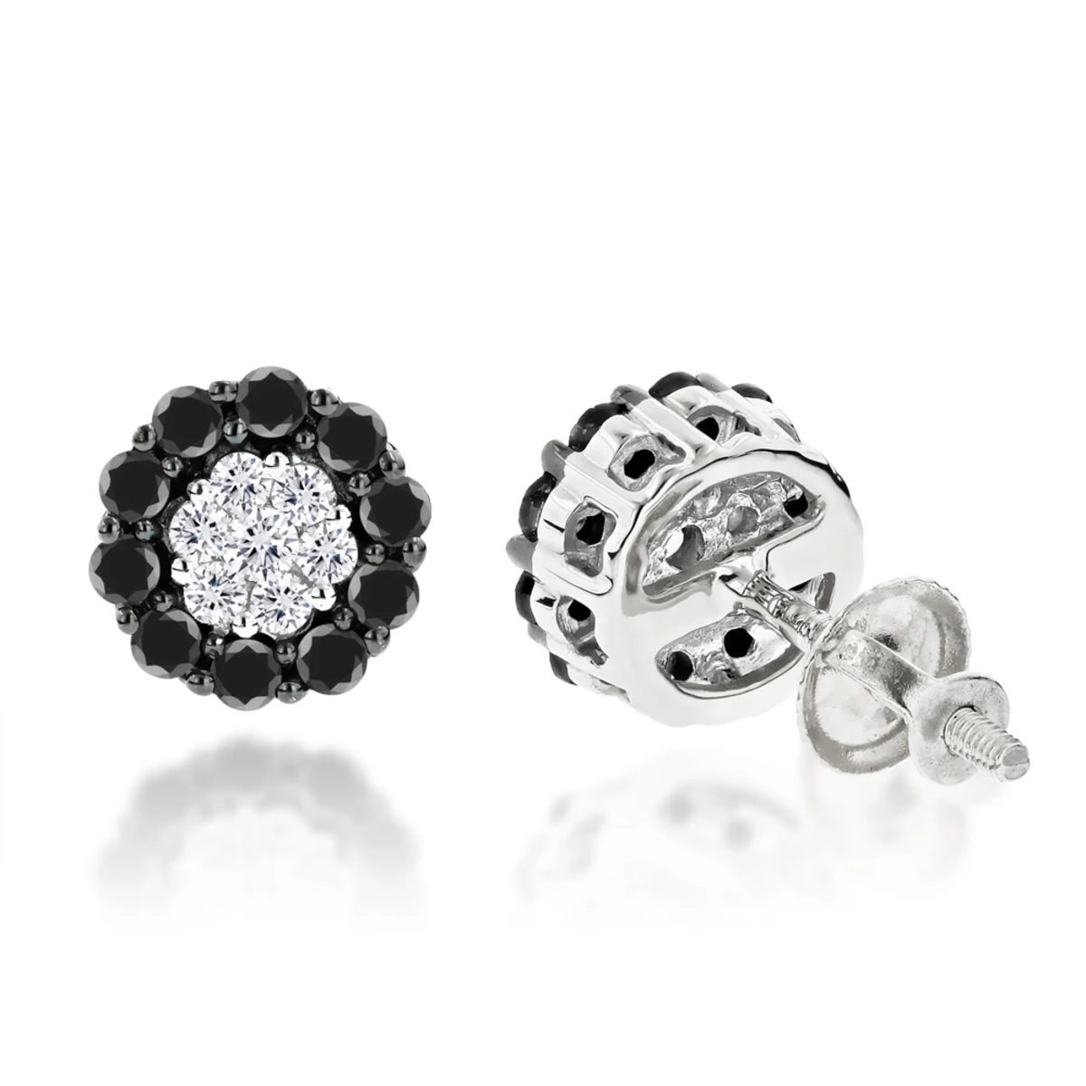 These Unique White Black Diamond Earrings 14k Gold Studs showcase 0.6 carats of genuine diamonds. Featuring a trendy two tone design and a highly polished gold finish, these unisex diamond stud cluster earrings are available in 14K white, yellow and rose gold.