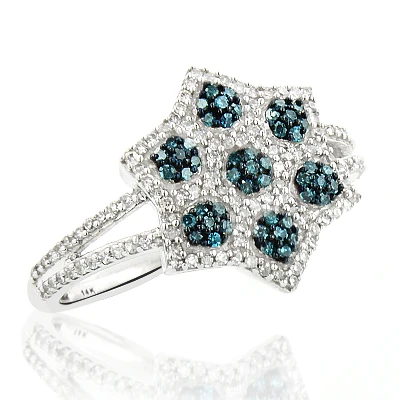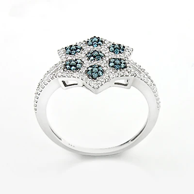 This White Blue Diamond Flower Ring in 14K gold showcases 0.47 carats of round diamonds and is available in 14K white gold only.