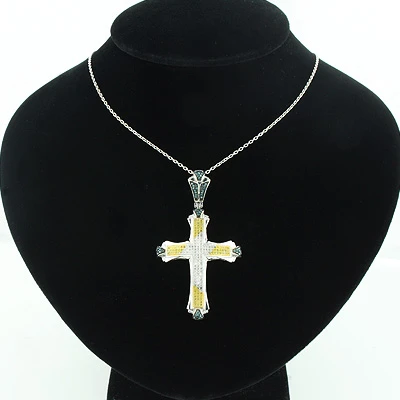This White Blue Yellow Diamond Cross Pendant in sterling silver weighs approximately 5 grams and showcases 0.56 carats of genuine diamonds. Featuring a trendy design and a luxurious rhodium plating for extra shine, this men’s diamond cross pendant is a great alternative to gold jewelry. Please note: The chain is for illustration purposes only and must be purchased separately. You also can personalize this piece or check we’ve already made and create your own design.